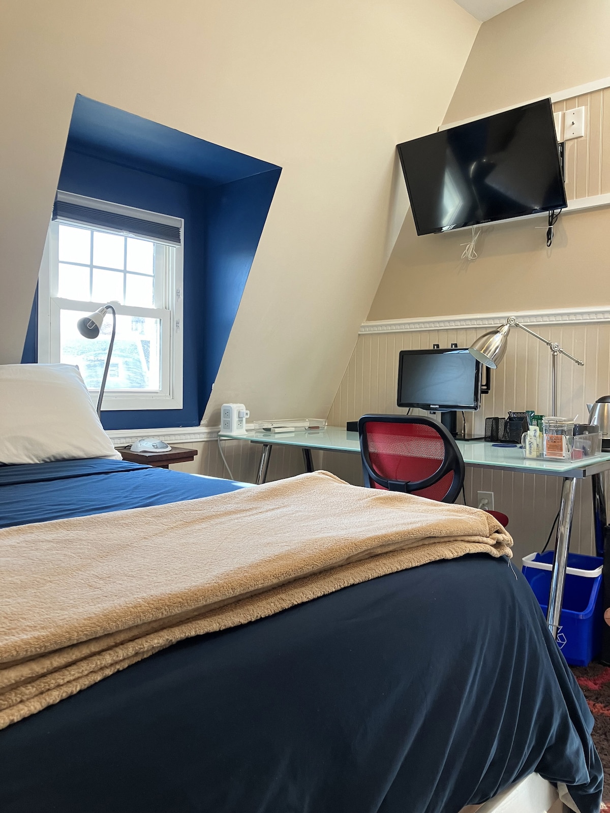 舒适的卧室,位于拥有110多年历史的房源中,配有大型办公桌