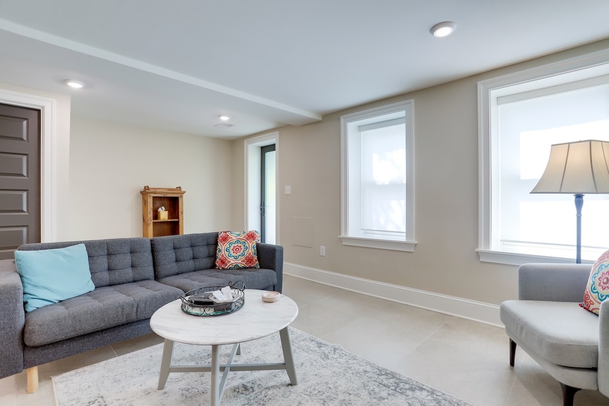 Just a few blocks from M Street and Wisconsin Ave., this modern, 1,000 square foot English basement features exclusive use of the entire lower level of a new Georgetown home and a private patio looking out onto a beautiful garden. Smart home features include voice commands for lighting, heating and cooling, a ceiling fan, door lock, and more. For working, there are two separate work spaces and fast, reliable Internet. For relaxing, we provide a full package of cable TV and streaming services.