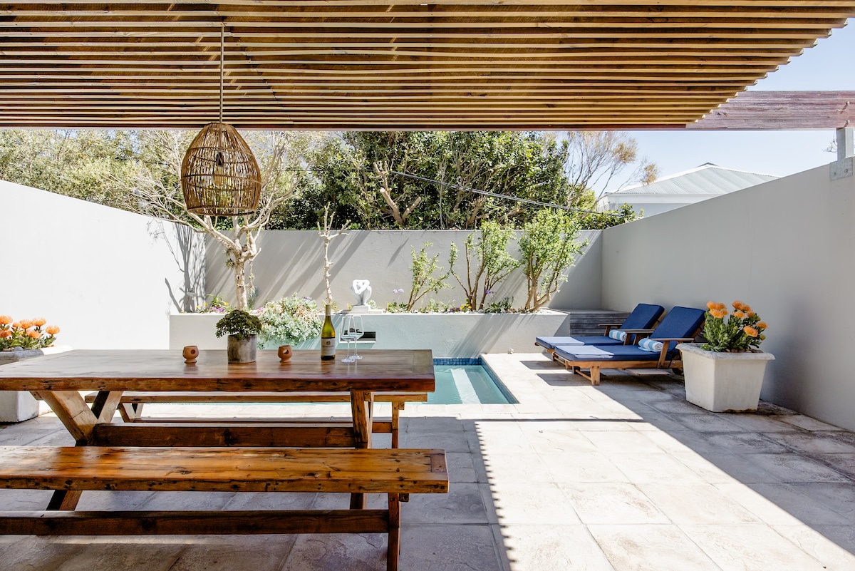 Unwind on the poolside loungers after a busy day exploring and enjoy the view of Table Mountain. This spacious modern studio looks out onto your own exclusive use luxurious private pool patio. Go for a morning stroll along the beach, just 100 meters away. Use the study desk area indoors, or the large poolside table outside on the sheltered patio to work remotely with our high speed Fiber. The studio has backup lighting, air conditioning, Netflix and your own gated parking bay.