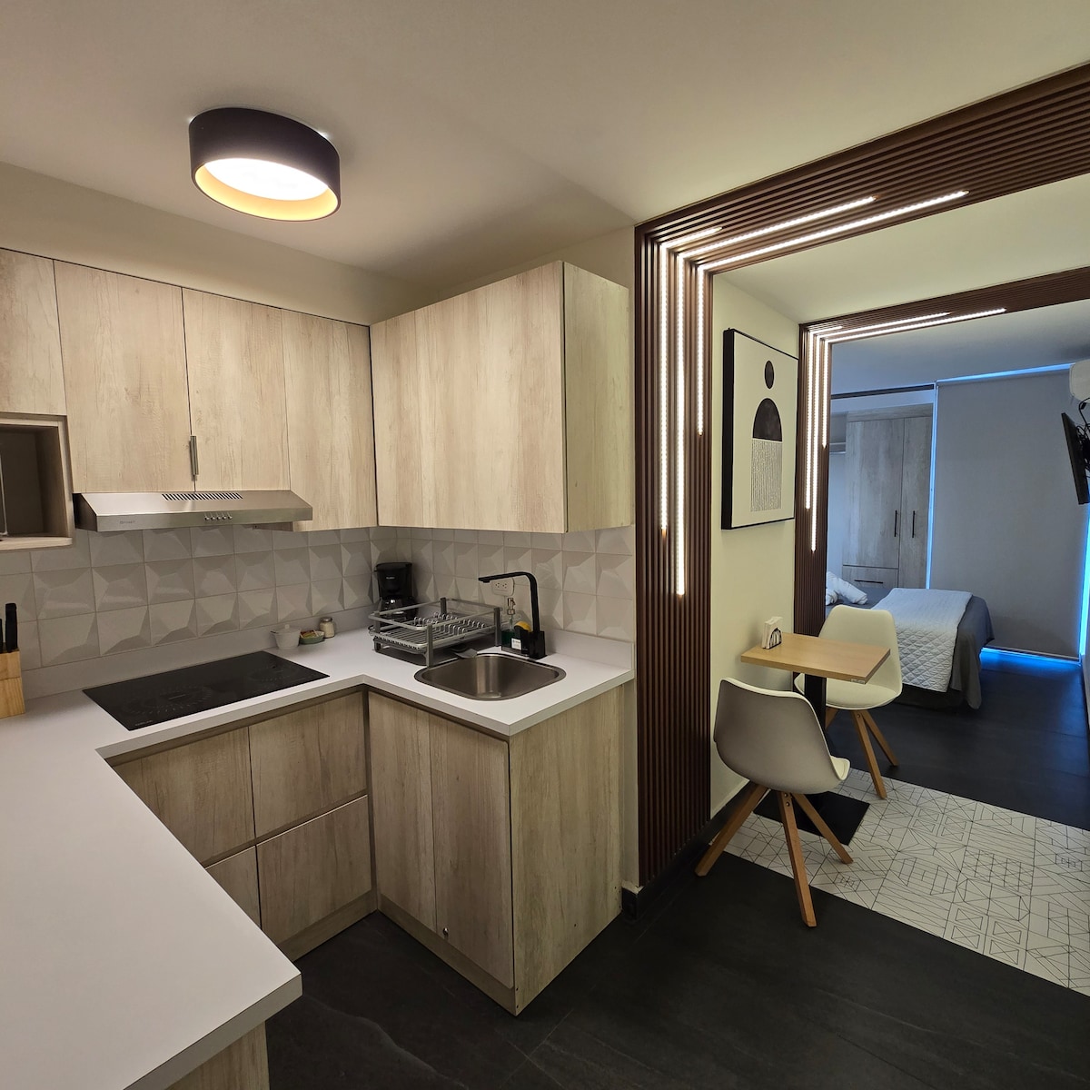 Modern, minimalist studio apartment, perfect for two people. Located in a safe, central area, surrounded by shopping centers, supermarkets, universities, restaurants, sports fields, and churches. Features include air conditioning, fast Wi-Fi, a Smart TV, a fully equipped kitchen, a washer and dryer, hot water, and private parking. The building offers 24/7 security with cameras. Ideal for travelers and digital nomads on short or long stays. Access to Gym for 30 days stays!