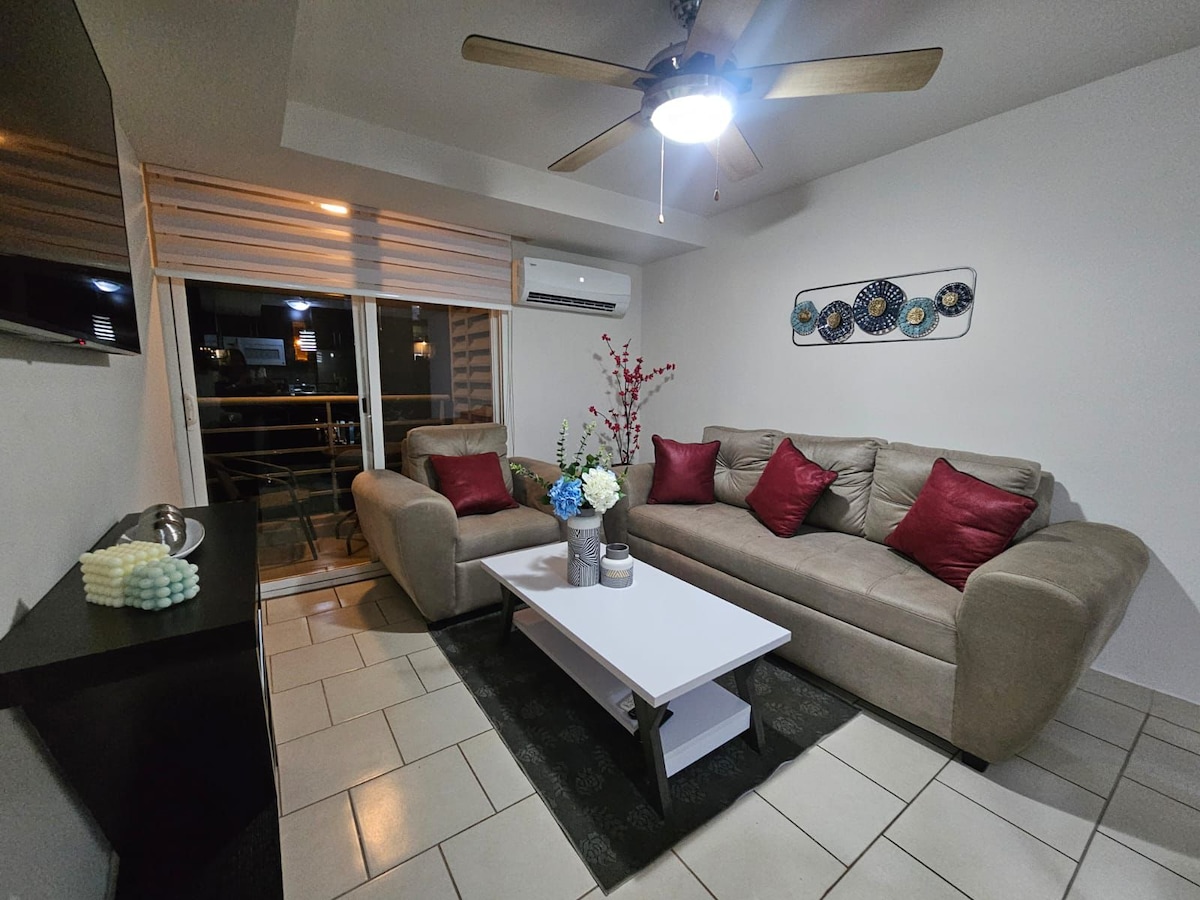 Enjoy a pleasant stay in modern comfortable condo with a wonderful view. Centrally located perfect for business trips. Restaurants and café across the street, less than 1/2 mile away from shopping mall and 3/4 mile from Centro Cívico Gubernamental. Includes parking space, 24 hr security, pool, gym, fiber optic internet. 82"living room TV w/surround system, 70"main room TV, range w/air fryer, fridge w/ice and water dispenser, washing/drying machine