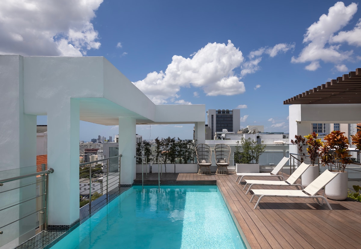 现代风格的 Piantini 单卧室公寓 | 顶楼泳池 + 天际线景观