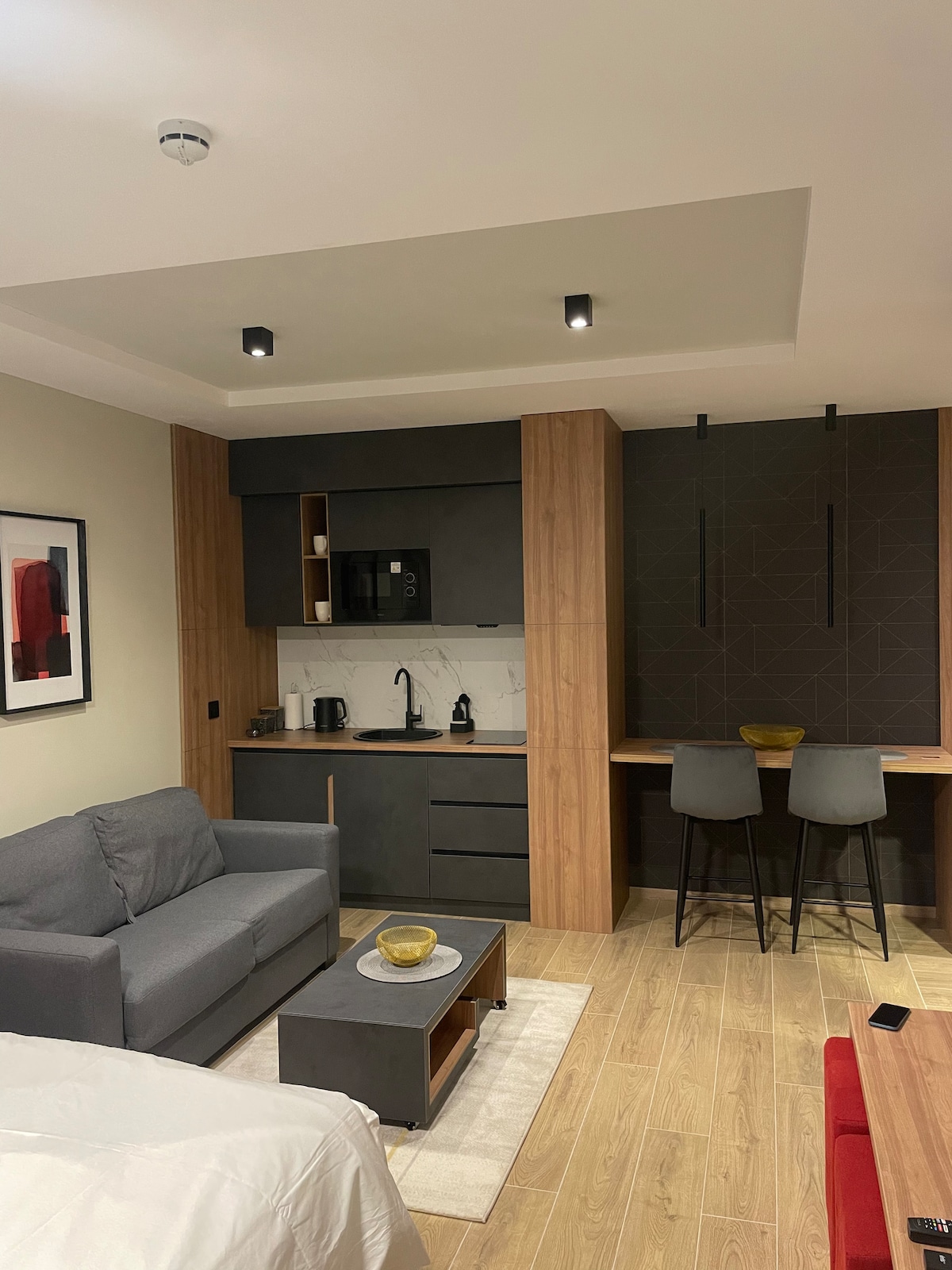 Welcome to our guesthouse, a simple yet inviting space on our family property. Inside, you'll find a well-lit bathroom with a rain shower, a TV, and internet. A coffee machine, fridge, and comfy sofa make the living area ideal for relaxation. An elevated space holds two mattresses—one for sleeping, the other for lounging—that convert into beds for groups of four. Outside, enjoy a seat at a table set before a hill of sun-loving plants. No kitchen, but home-cooked meals are available upon request.