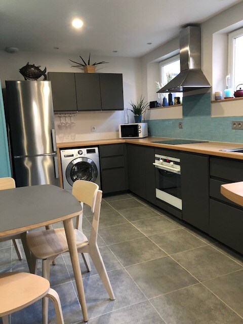 Appartement de très bon confort, en rez-de-jardin,de 3 pièces en parfait état de 46 m2,se composant de: un jardinet/terrasse de 30 m2, entièrement clos, au calme (se situe au fond d'une impasse), très bien exposé (orientation Sud Ouest),équipé d’une table de jardin,d’un parasol et de 2 transats. un salon:un grand canapé confortable,un meuble de salon avec poste TV,un autre meuble bas, une chaise pour bébé une cuisine ouverte sur le séjour, entièrement équipée: