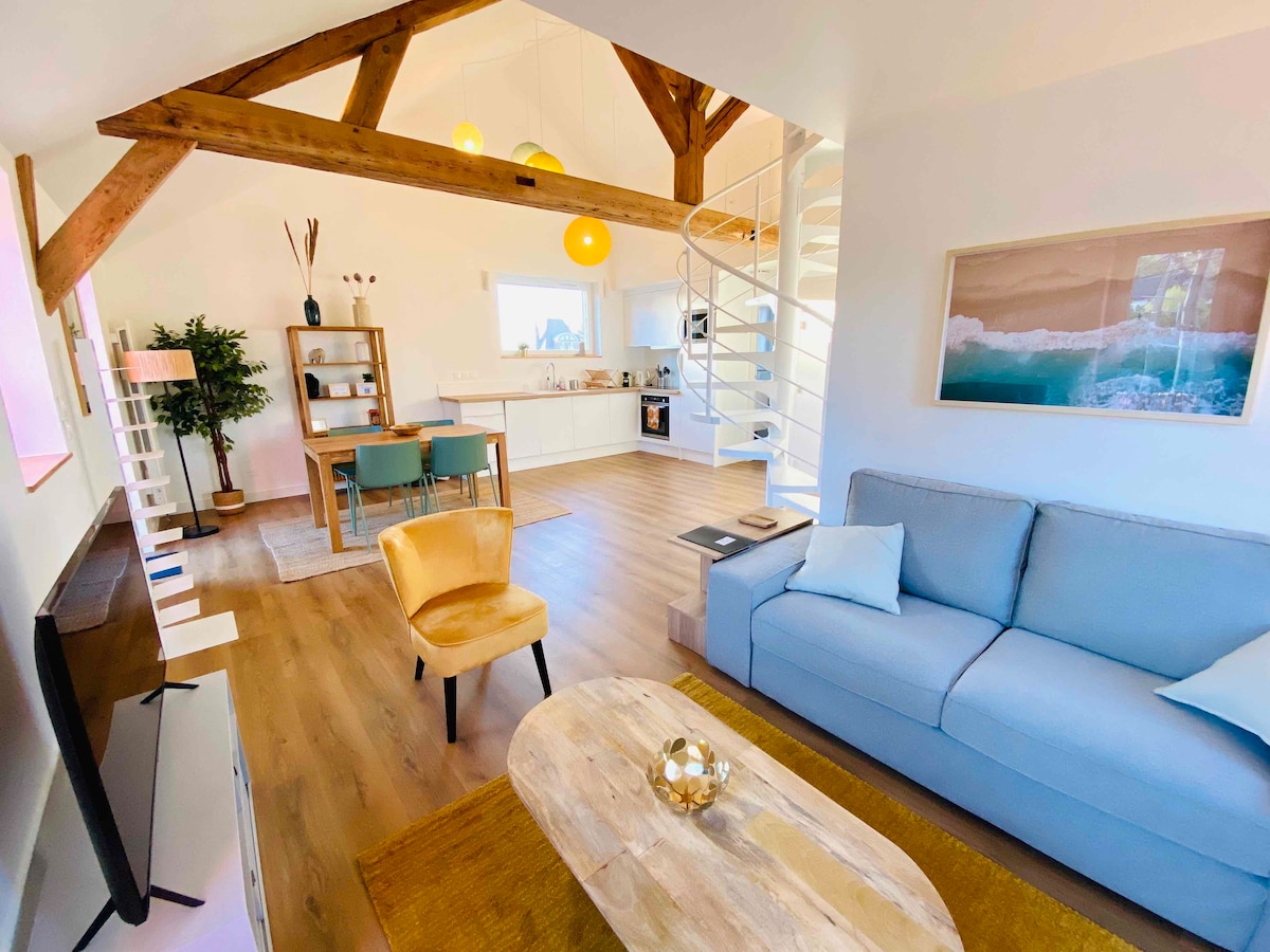 Magnifique appartement, à 50m de la mer et 250m du centre ville, entièrement rénové en 2024. Ce qui le rend unique : son esprit loft avec son toit cathédrale, sa luminosité, ses vues mer au loin et le parking privatif (bien appréciable en haute saison) ! Situé au 2ieme et dernier étage, sans ascenseur Idéal pour un couple cherchant le confort, ou une petite famille (max 4). 2 chambres, dont 1 ouverte en mezzanine (attention obscurité imparfaite) Linge fourni, Internet haut débit