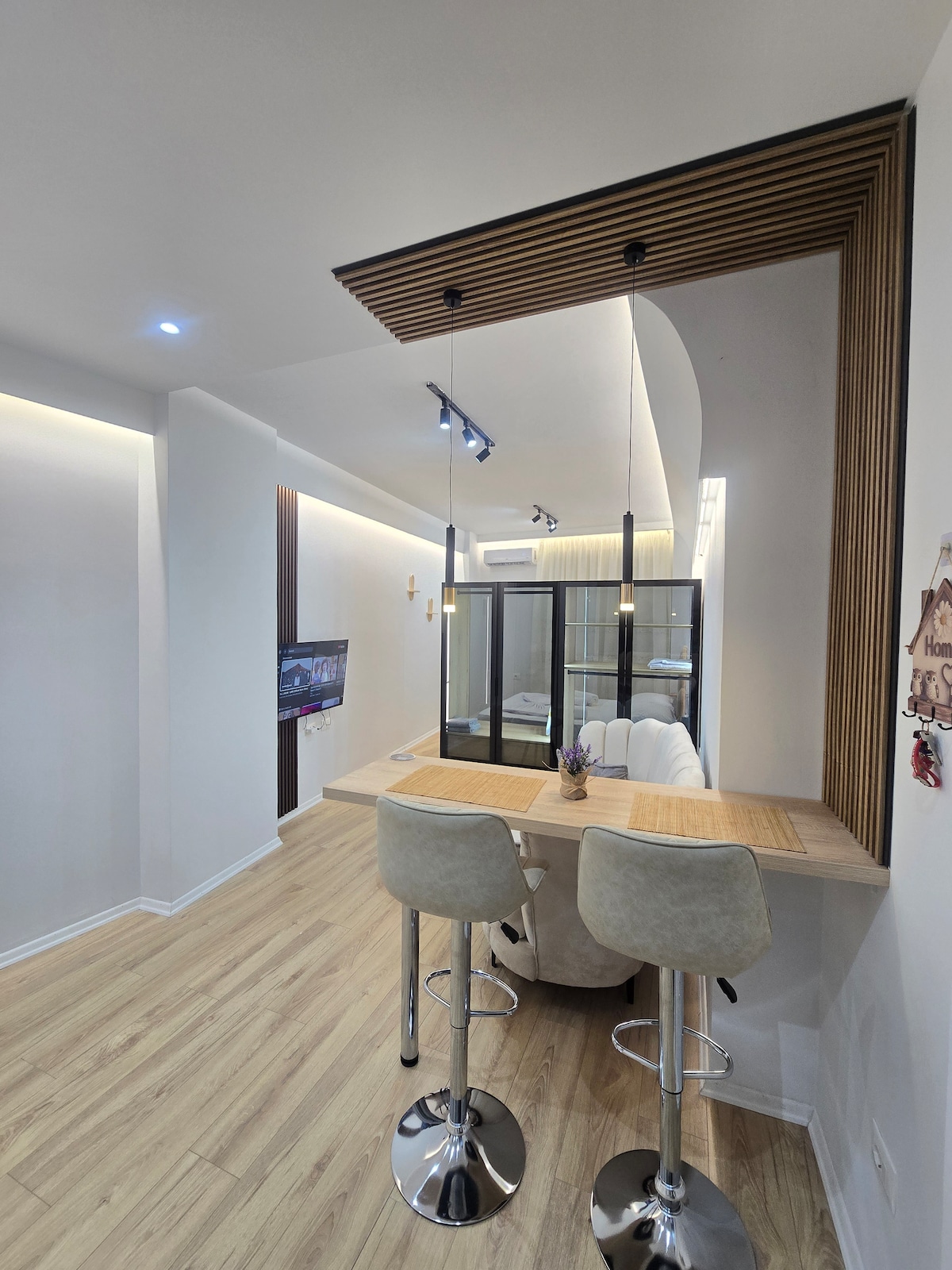 Step into a world of sophistication and artistry, where Parisian style meets contemporary luxury. Adorned with stylish mouldings, elegant furnishings, and natural plants, this apartment is a haven of elegance and charm. Lose yourself in the beauty of forest-themed mural, adding a touch of enchantment to the space. Whether you're curled up with a book in the cozy seating area or indulging in a glass of wine on the balcony, every moment is imbued with an air of refinement and grace.
