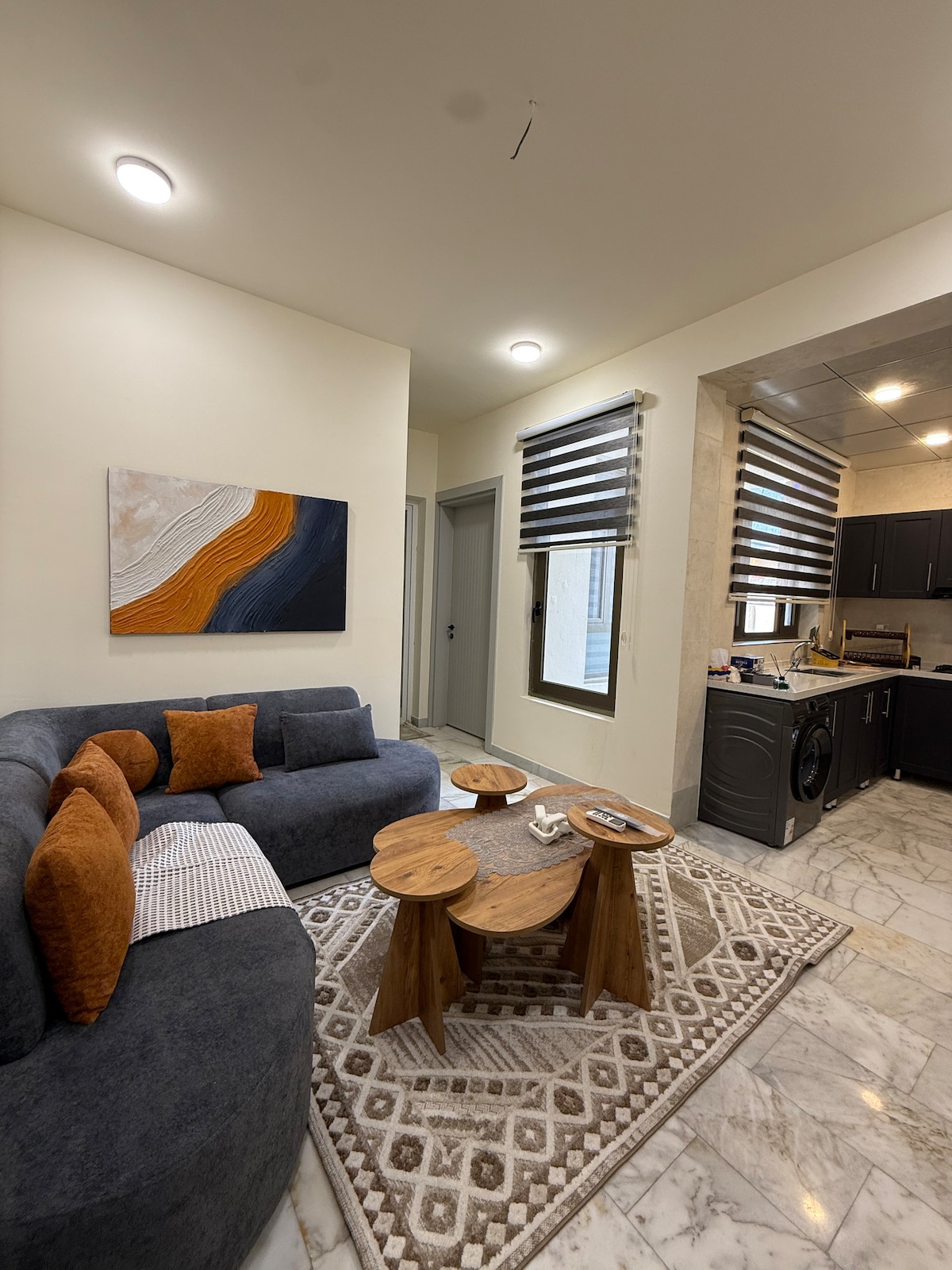 City center charm! Queen bed oasis w/ single option, heart of Mansour. Walk to shopping malls, cafes & more. AC chills, compact kitchen fuels. Modern nest near public transport. Unwind on comfy sofas, wash & stay. Your downtown Baghdad