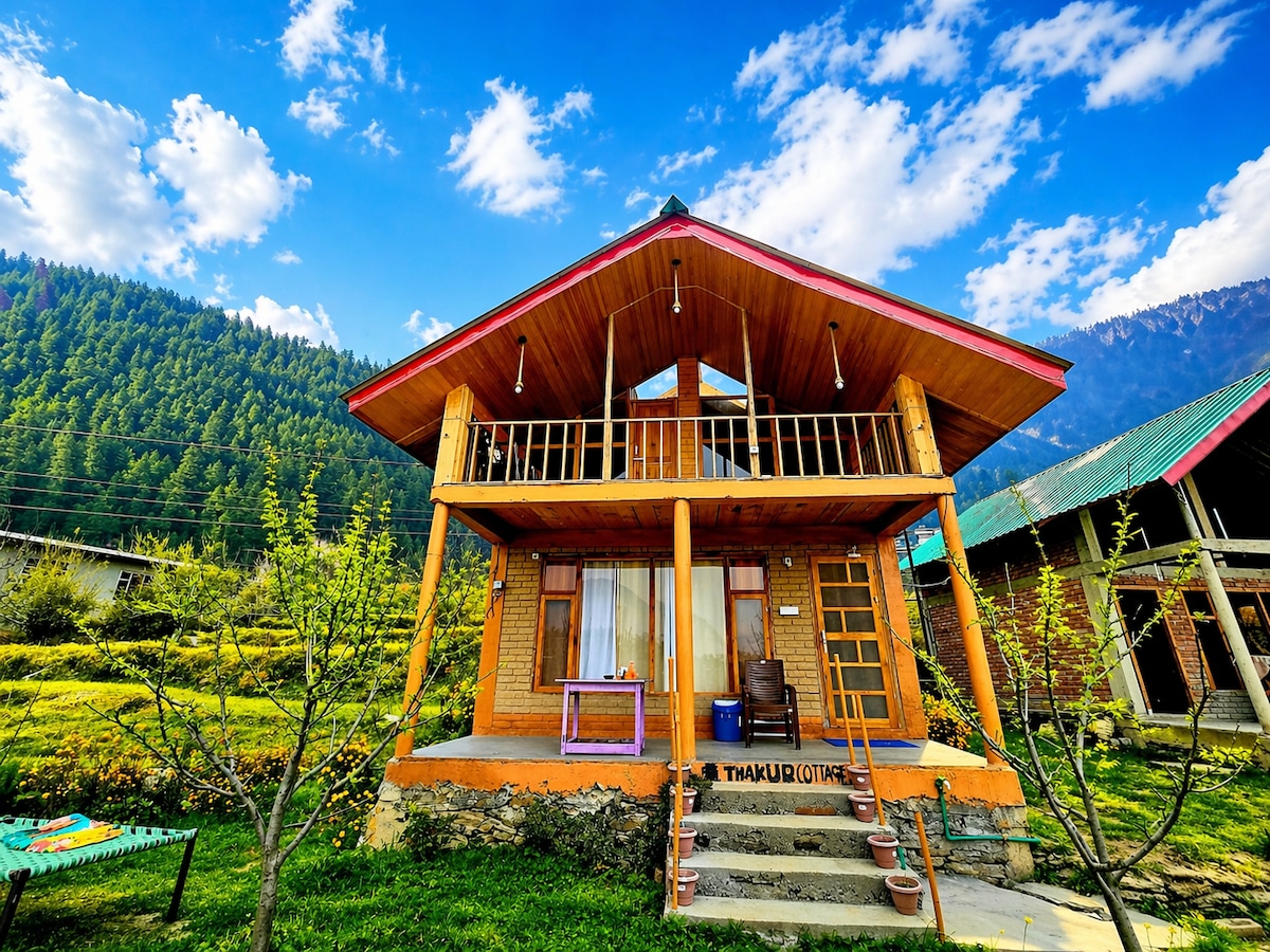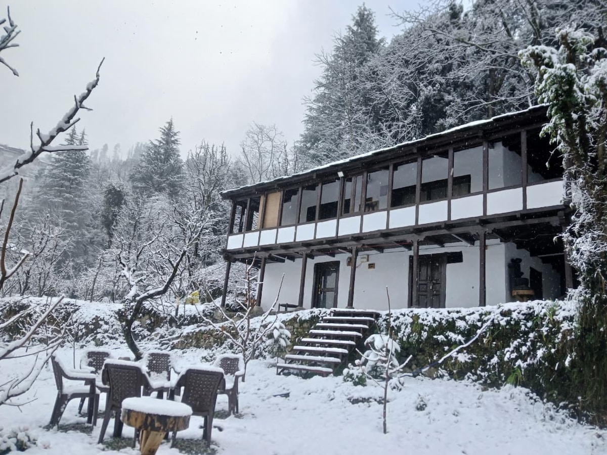 A true-blue working Apple orchard, barely 400 meters from the iconic & world-famous NAGGAR CASTLE, in a quaint little village called Chanalti. It is a rustic village set-up but fitted with all modern-day comforts - along with unending cups of herbal tea, coffee & stories to share! It is a place where the air is always fresh, the views are always stunning, and our hospitality is always homely, warm and welcoming! Min 2 Night Stay required! Pls. DO NOT book for 1 Night. STAGS NOT ALLOWED 🚫
