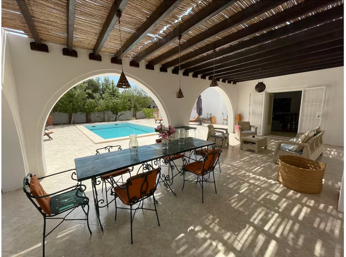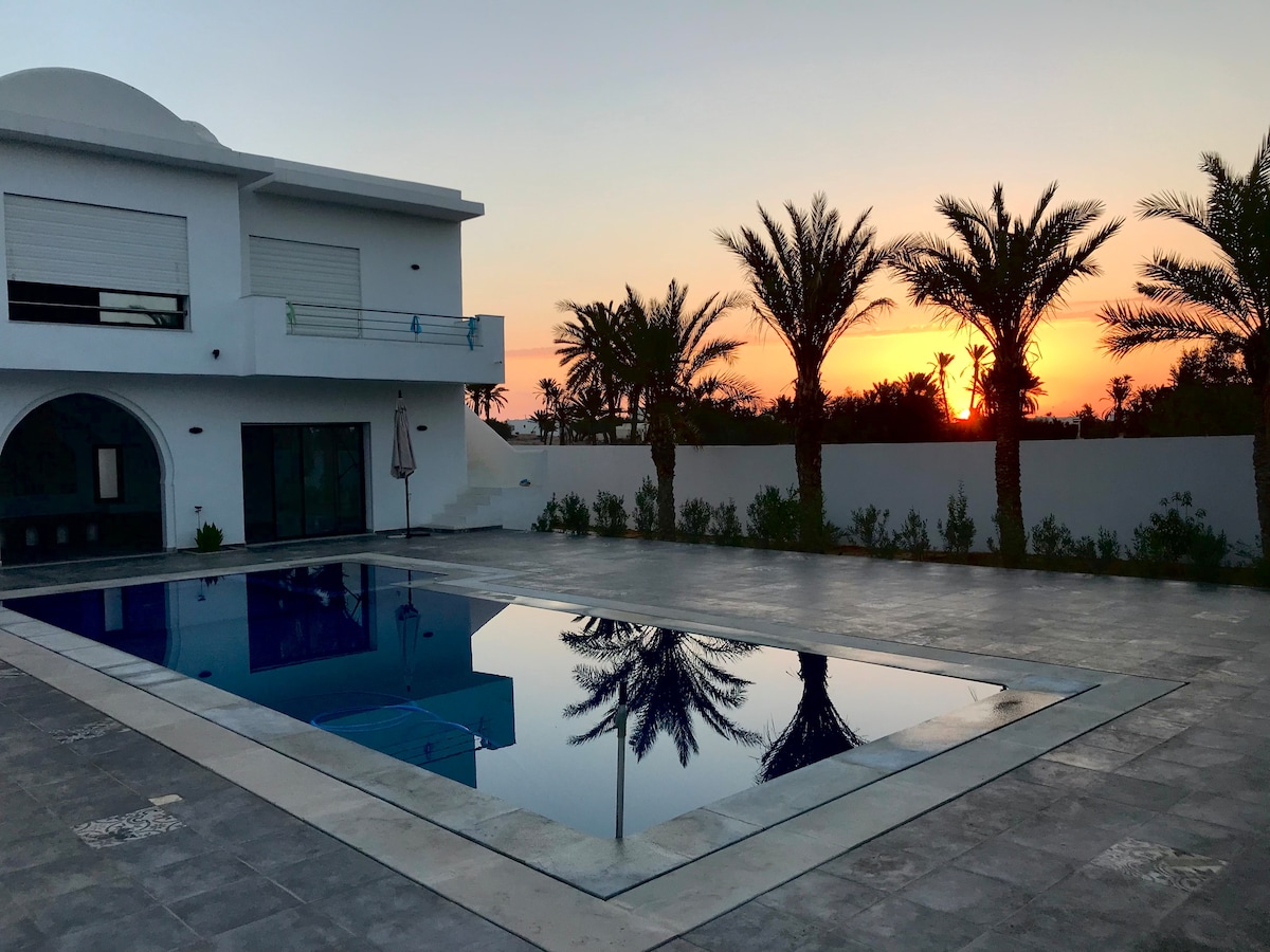 Bonjour , je vous propose une belle villa avec piscine à l’île de Djerba au sud de la Tunisie , avec un salon , 3 chambres , 3 salle de bains une avec jacuzzi , une grande cuisine équipée, avec un grand jardin gazonné. 5 minutes de Houmt souk centre , 5 minutes de Midoun , 3 minutes de la plage