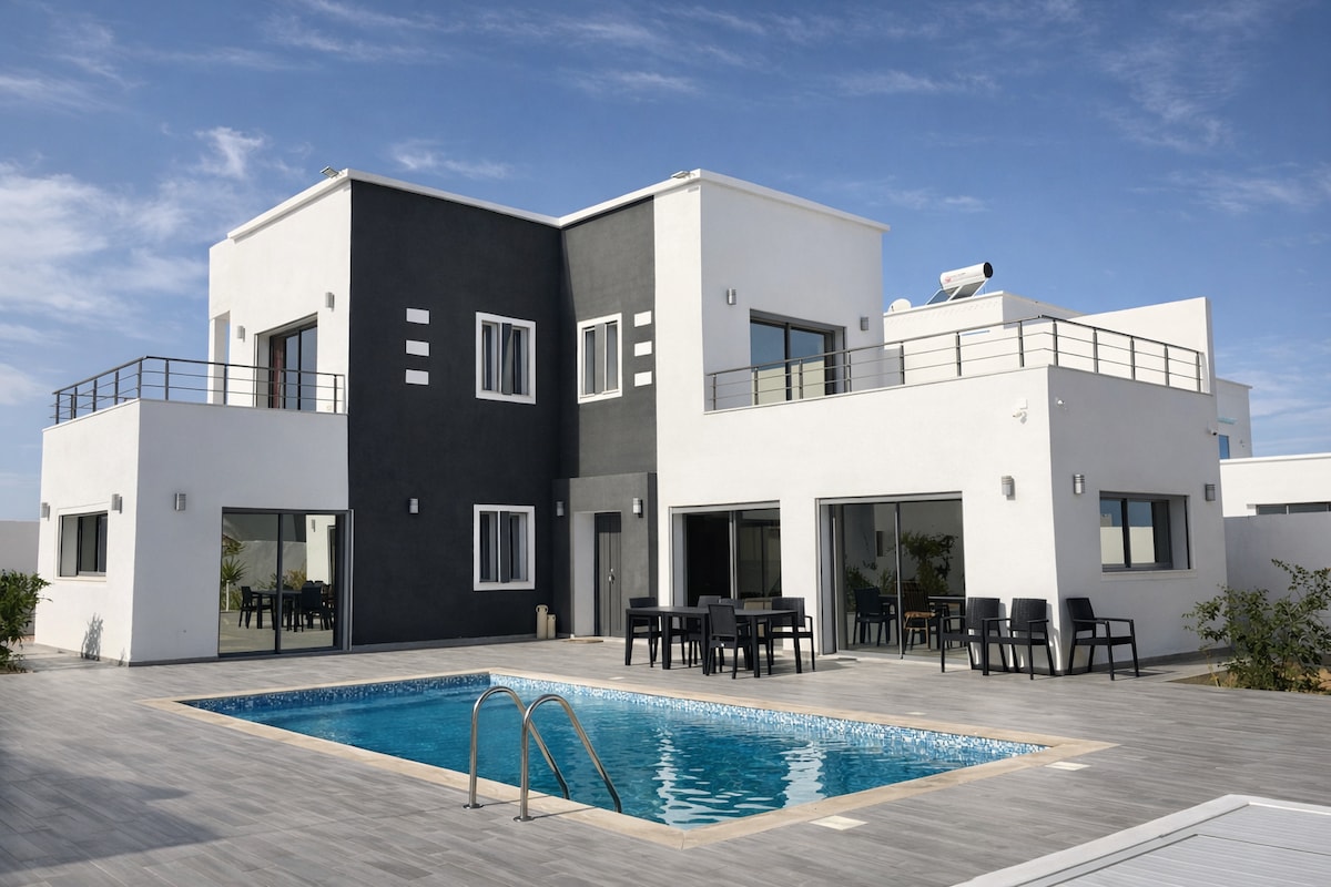 Profitez en famille de ce fabuleux villa haut standing à djerba Tezdain vue sur mer sans vis à vis avec piscine séparée pour enfants ,qui vous offre de bons moments en perspective à 4 minutes du Laguna et de la mer ,babyfoot ,à 25 minutes de l’aéroport de djerba emplacement très calme centre ville midoun a 5 minutes ,épicerie et café à 400 mètres ,8couchages+1bébé nettoyage,draps , serviettes, couettes,internet haut débit illimité , netflix gratuit,réserve d’eau 5000 litres en cas de coupure