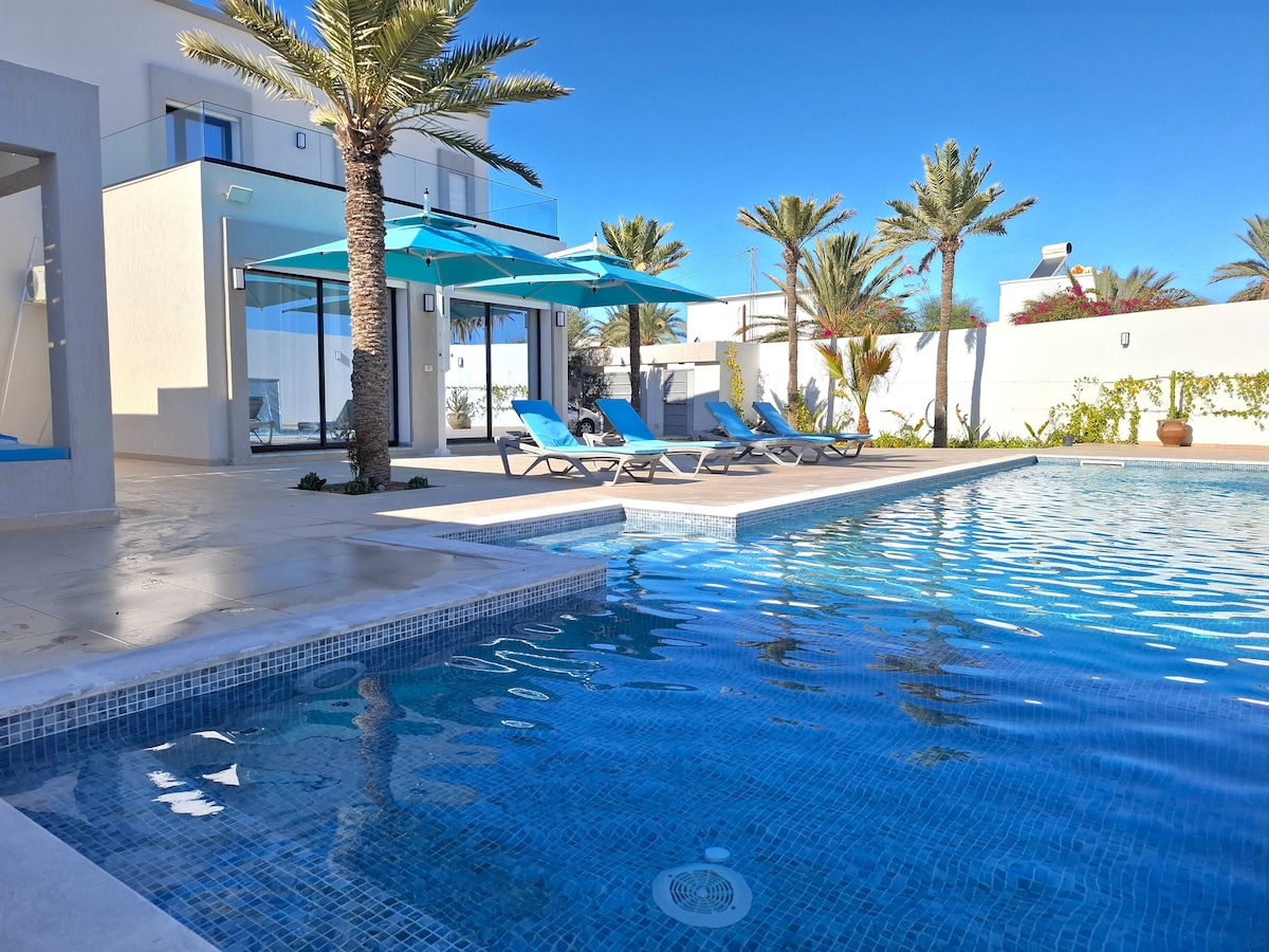 🏝️bienvenue à villa Lamys Djerba 🏝️ magnifique villa avec piscine privée sans vis à vis très bien située dans un quartier calme à 400 mètres de la mer, de la corniche et de la route qui mène à la zone touristique a 10 minutes seulement de la plage, à 5 minutes du centre ville de houmet souk ou ce trouve, le souk, banques, bureaux de change, restaurant, marina, café et sites emblématiques de l’ile. À 15 minutes de L’aéroport à proximité de toute commodité, lieux de détente et d’attraction.
