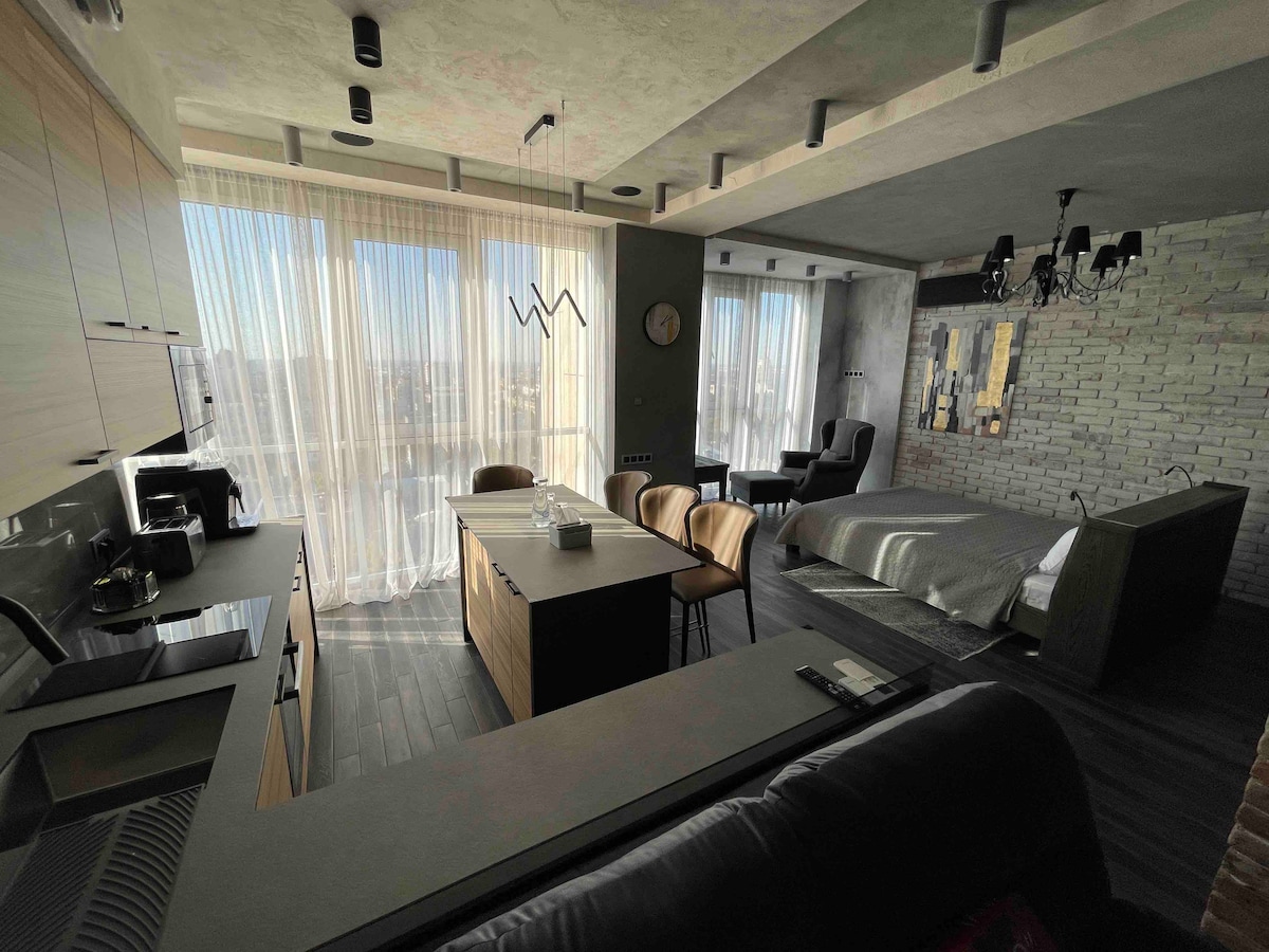 Уникальное жилье с собственным стилем — то, что надо для отличных воспоминаний?При бронировании этого номера,Вы погрузитесь в шикарный интерьер в стиле лофт с аутентичным кирпичом 18-19века, дизайнерской мебелью из массива ясеня! Роскошная студия может интегрироваться меньше,чем за минуту в спальню и кухню-гостиную!Все продумано до мелочей!!!Объект оснащён инновационными системами очистки воды, рекуперативной вентиляцией, тёплым полом, современной техникой..но главное-потрясающий вид из окон!!!