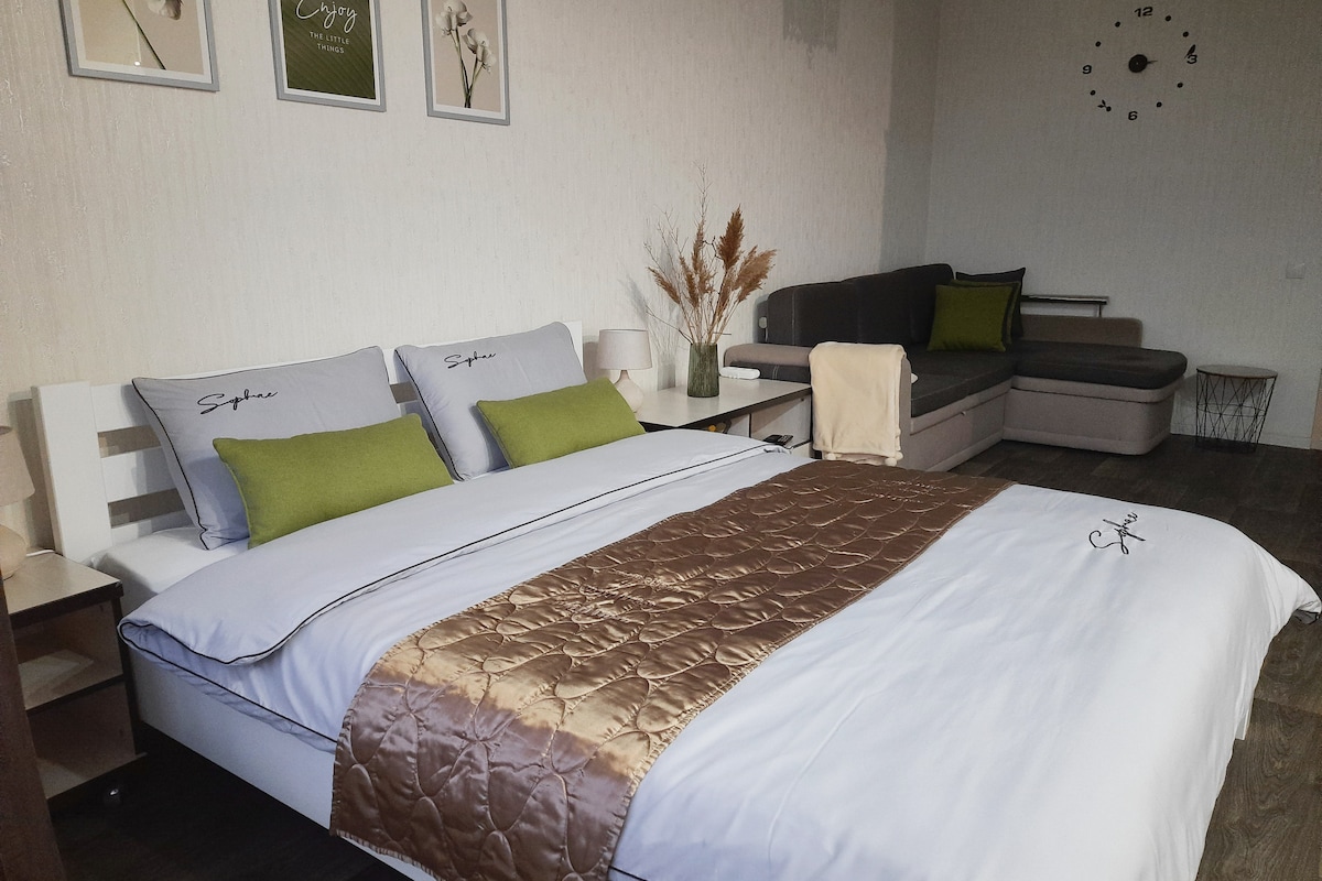 Green studio apartment is situated in the heart of Dnipro city The apartment is on the last 9th floor and the size is about 35 m2 The ceiling height is more than 3 meters, that is why the apartment looks spacious. Soft comfortable bed, fully equipped kitchen including a washing machine and microwave. The brand new and latest QLED model of Samsung smart tv. The bathroom has a shower and separate toilet room