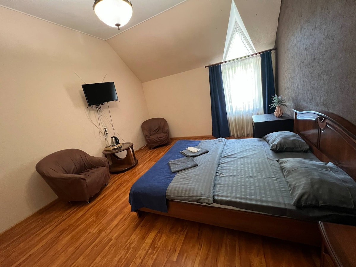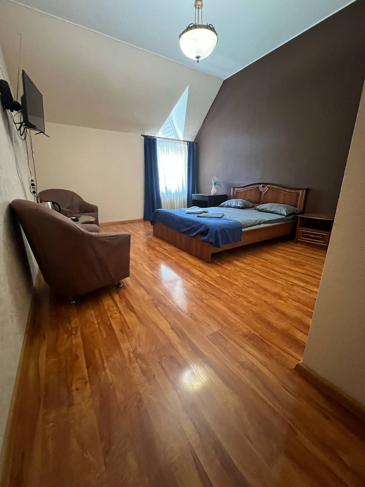 Знаходиться в 3 хвилинах біля Ж/Д Вокзалу та Автовокзалу. Велике зручне ліжко, кондиціонер, телевізор , обслуговування 24/7 , 2 туалета,2 душа , завжди е гаряча вода,безкоштовний вай фай, у продажі е напитки та іжа.При готелі е пральна машинка та сушарка (платно) ! Багато посуду, кавомашина,великий холодильник