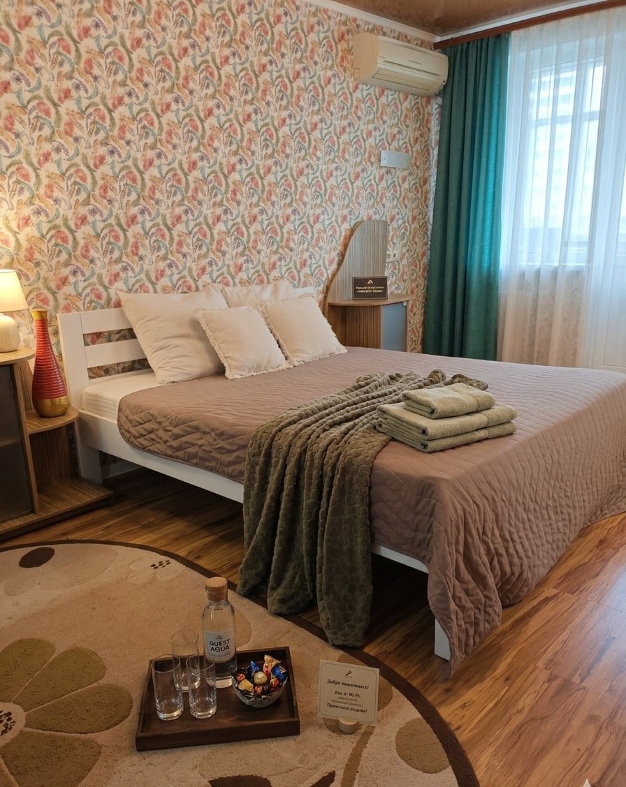 Жилье великолепно: в нём вас окружает стиль. новая , свежая однокомнатная квартира, с красивым интерьером, в квартире все необходимое для комфортного проживания, рассчитана на двоих, в квартире есть ванна и гигиенический душ, смарт ТВ, интернет, гардеробная, рядом находиться ресторан