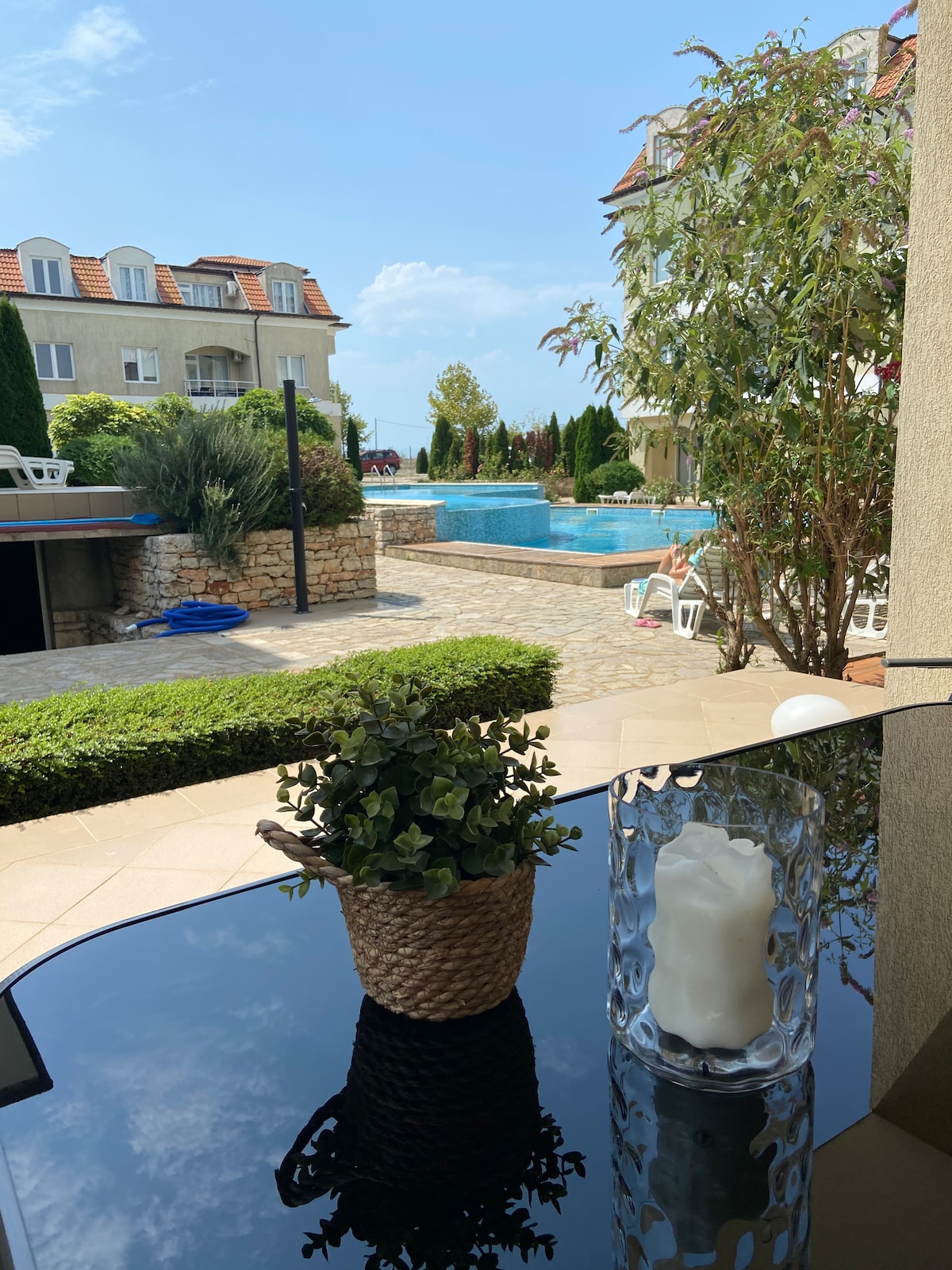 Beautiful, spacious and fully equipped apartment with two private terraces in Bozhurets, Kavarna. The common facilities include a swimming pool (ca. 06/15-09/15), free sunbeds, an actvitity room with tabletennis and free parking . Several nice and clean beaches in the area. A great place to enjoy a relaxing summer holiday. Three golf courses (Thracian Cliff, BlackSeaRama and Lighthouse) close to the apartment, making it the perfect place to stay for a golf holiday.