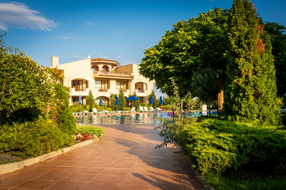 Located between Balchik and Kavarna in the extremely quiet area of Ikantalaka, Villa Romana is the perfect place for a family vacation. The complex is located on the first line. Villa Romana has a large pool with a children's section, playground, restaurant with very good cuisine, gym and free guarded parking. The sea is 50 meters from the apartment. The complex is closed and outside visitors are not allowed. There is a small beach in front of the complex and 4 more beaches nearby.