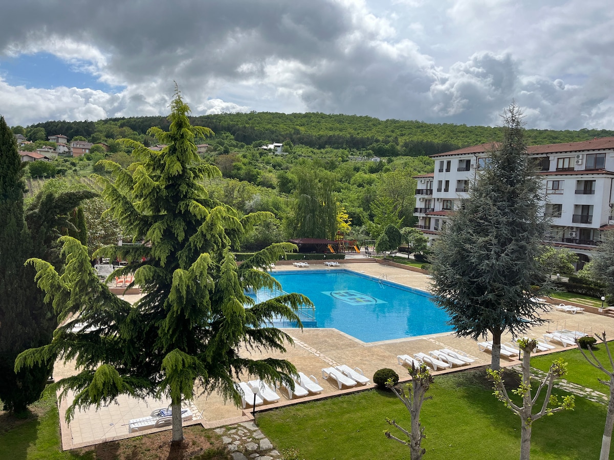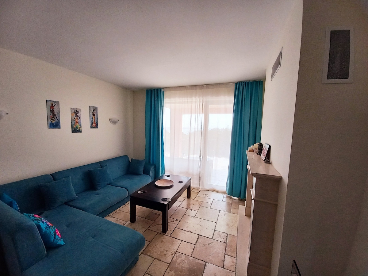 Perfect for couples, but also for families with one children, Teomat Studio is located in Kaliakria Resort with 5 pools, 3 restaurants (on of them is the famous El Balcon Del Mundo ), free parking, relaxation and green spots, surrounded also by a lot of points of interest(Aquapark at 3min walk distance, horse riding, kids club, beautiful Adora Beach and Bendida Beach at 5min by car).
