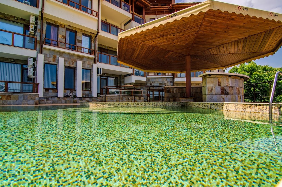 Luxury apartment for seaside vacation in Kaliakria complex. The apartment is suitable for 2/4 people - it offers 1 bedroom with a double bed, a living room with an equipped kitchen, a sofa bed, a washing machine, a bathroom with a shower cabin; a lovely shaded terrace with a view of the Infinity swimming pool and the garden.