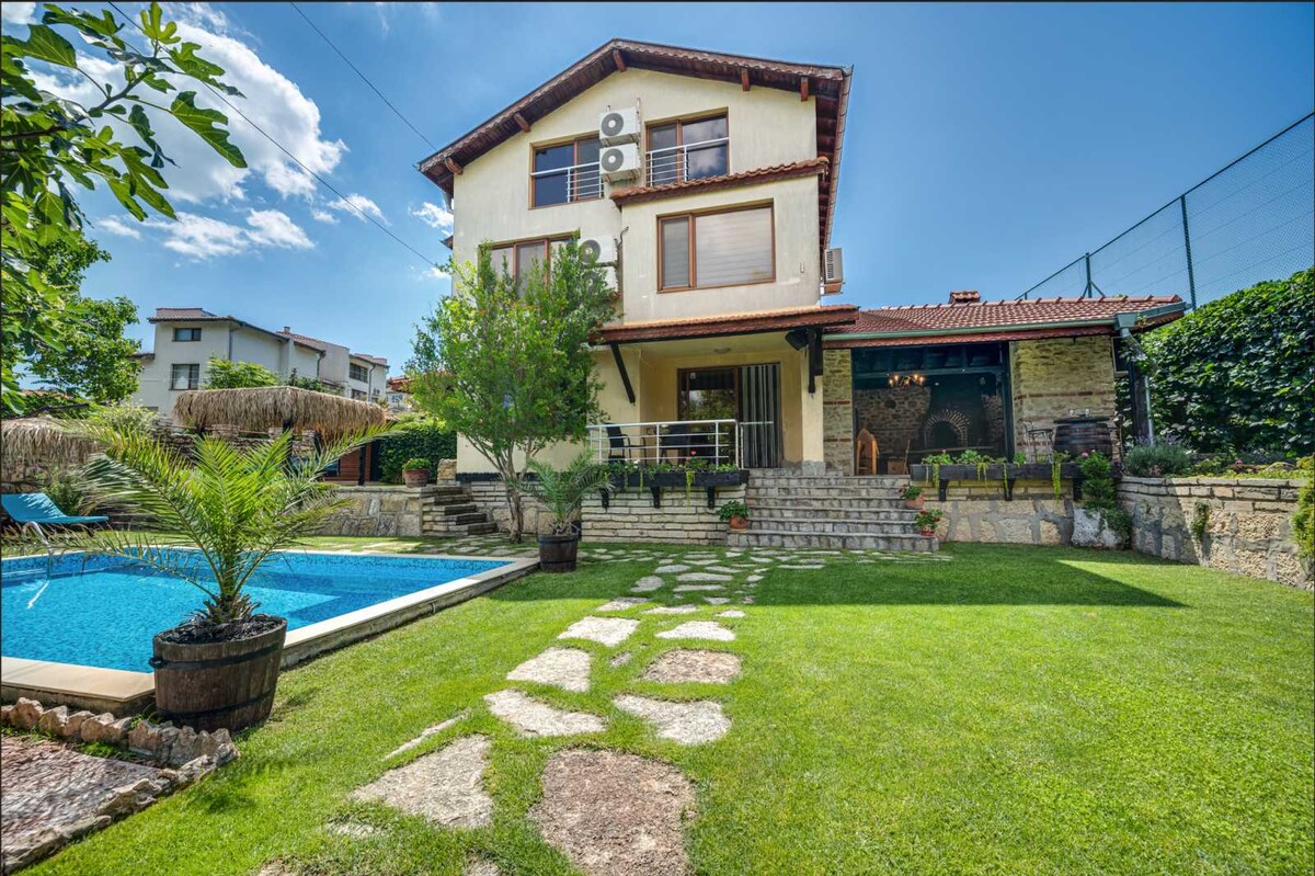 A modern and spacious 6 bedroom , 4 bathroom house with huge 4000 sq.m. garden is surrounded by oak forest, offers spectacular sea views and 50 m2 pool. Completely private, suitable for families, groups, special events. Plenty of activities like table tennis, badminton, basketball, kids playground, Golden Sands and Albena nearby
