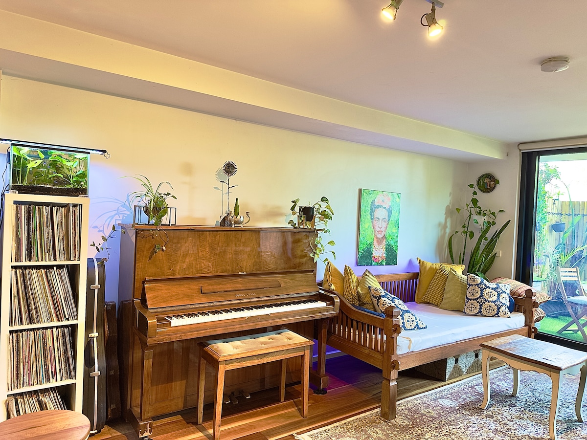 露台、艺术品、钢琴、黑胶唱片和植物,地理位置优越