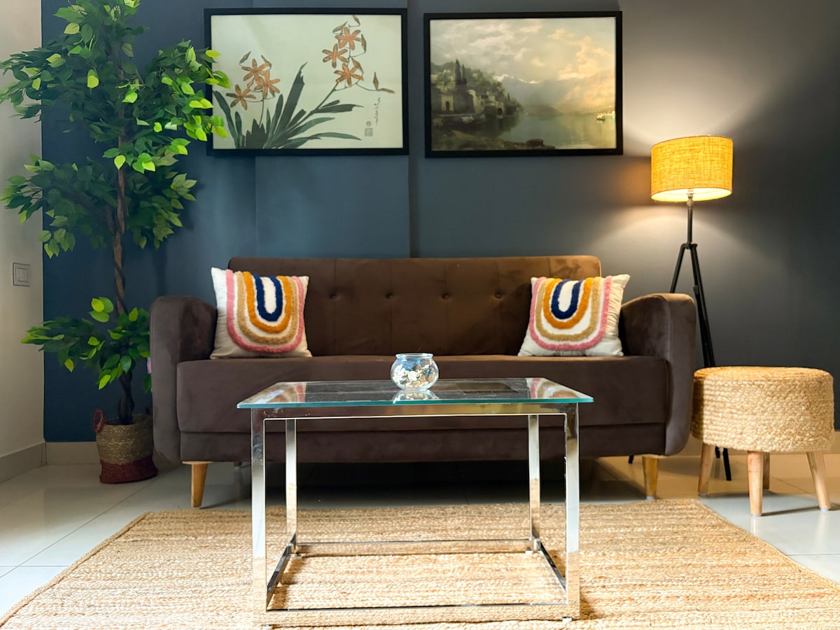 Welcome to our brand new, premium 1-BHK apartment, ideal for couples and travellers seeking comfort and privacy in an excellent central location. The bedroom has a queen bed with soft orthopedic mattress for a restful night's sleep. Relax in the cozy living room with a Smart TV, lightning-fast WiFi and open kitchen area. Comes with a super clean bathroom stocked with bath essentials. The fully equipped kitchen includes high-quality appliances and crockery for your culinary adventures!