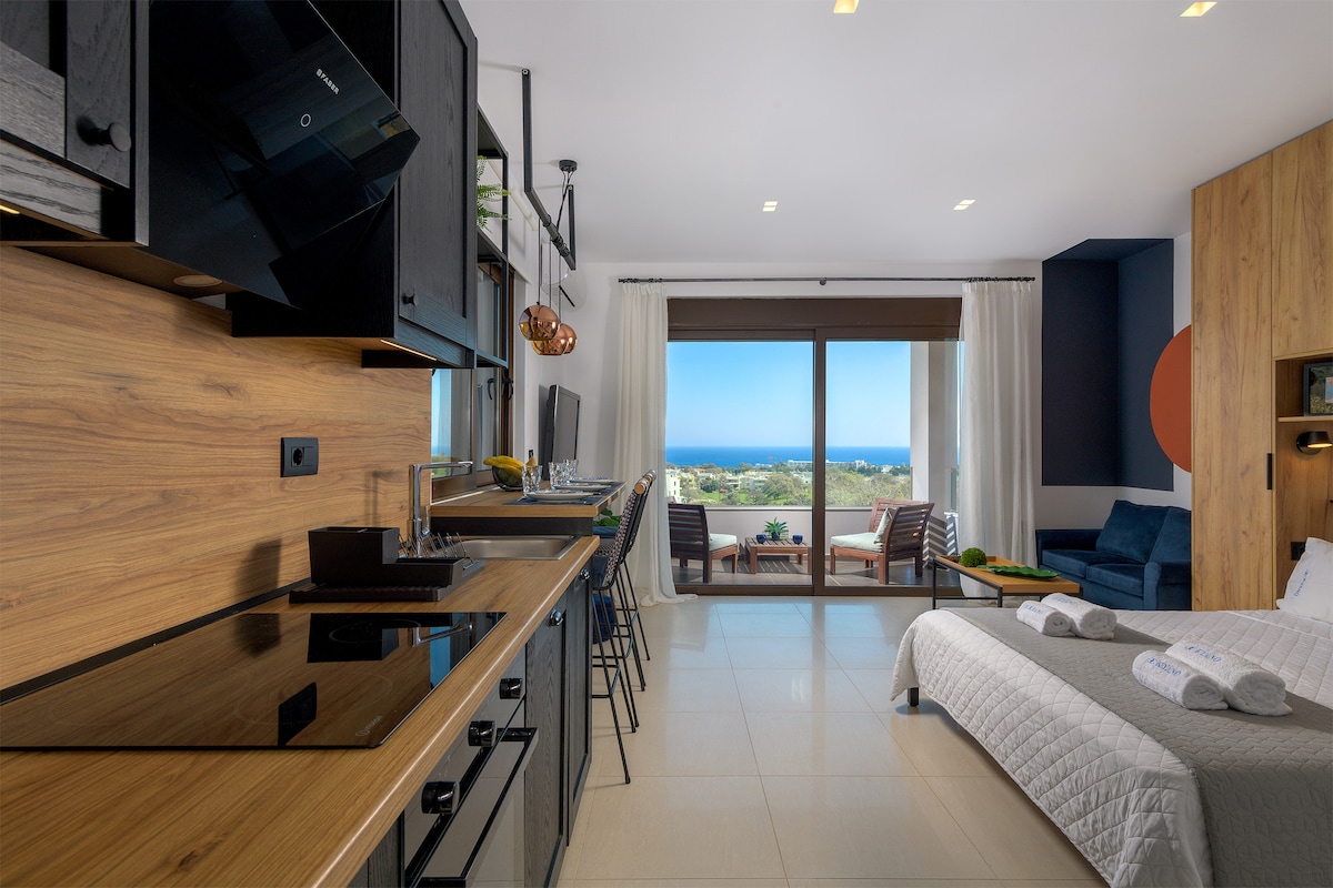 This beautiful modern apartment, literally just 3 minutes North from the centre of Elounda, is located right on the watersedge of the bay of Mirabello with it's crystal blue waters, and even has a view of the island of Spinalonga, the famous Venetian fortress turned leper settlement. Housing up to 3 people, it is both ideal for a family that wants a relaxing swimming holiday as well as people that want to enjoy the nightlife of Elounda.