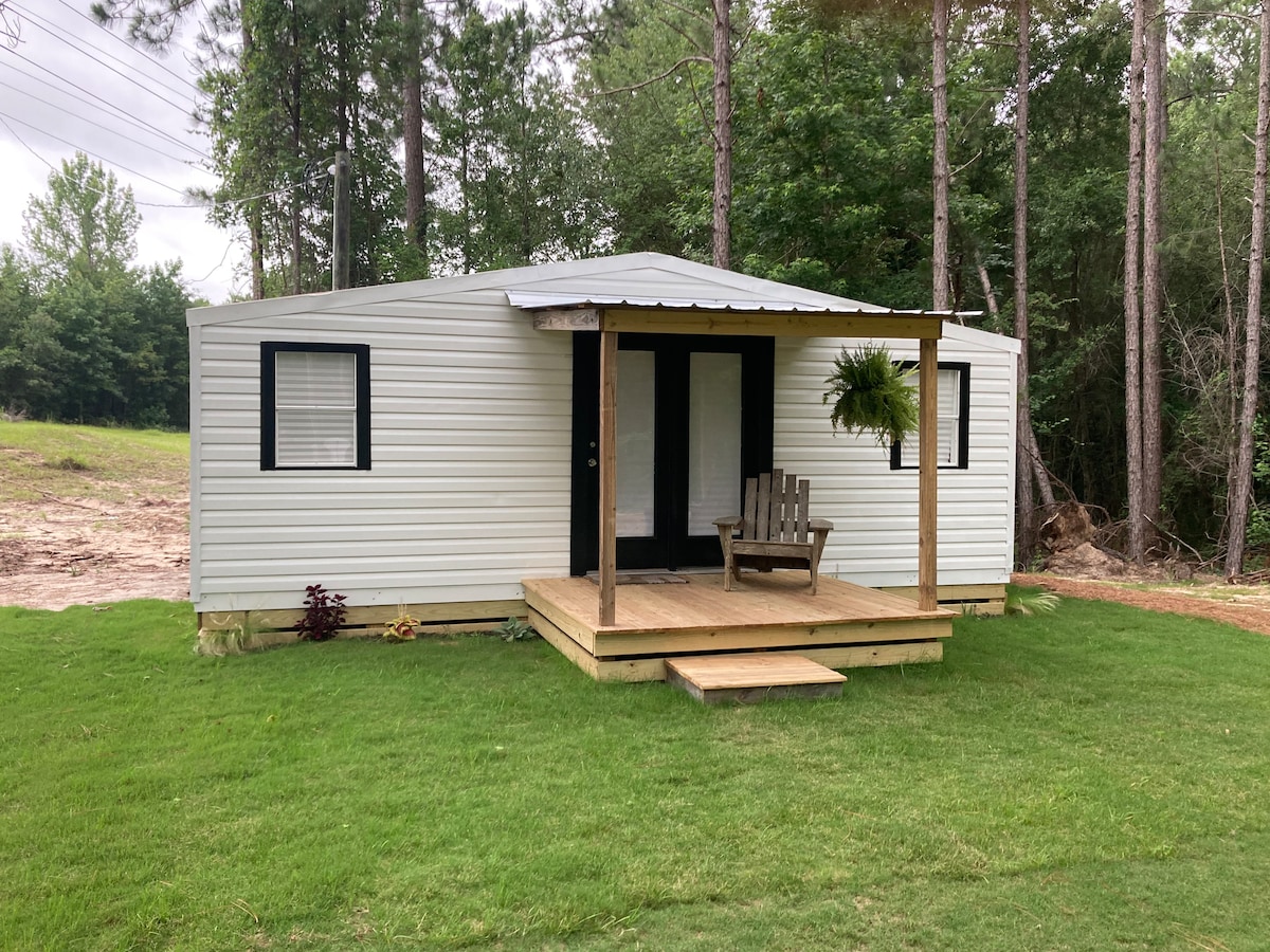 Enjoy nature with all the comforts of home. Brand new up cycled modern tiny house in a quiet setting just outside the city limits. Clean & pristine 240 square foot home with front porch, cold a/c, hot shower, kitchenette, 50 “smart TV, comfortable, queen bed., outdoor recreation area with new gas grill. All the amenities of a hotel but with the added benefit of privacy!!!