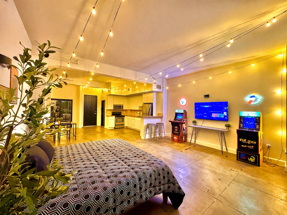 洛杉矶市中心宽敞有趣的 420 号 Loft 街机房,配备加大双人床