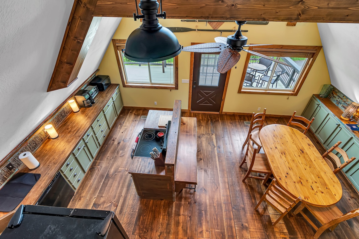 Welcome to The Tree + House at Indian Point! This custom luxury treehouse was built with comfort and relaxation in mind. Perfect for up to four guests, it’s surrounded by forest and filled with natural light from floor-to-ceiling windows that showcase stunning views of Table Rock Lake. You’ll feel tucked away in your own private retreat, yet still be just minutes from the water and Silver Dollar City. It’s the ideal mix of peaceful nature and modern style.