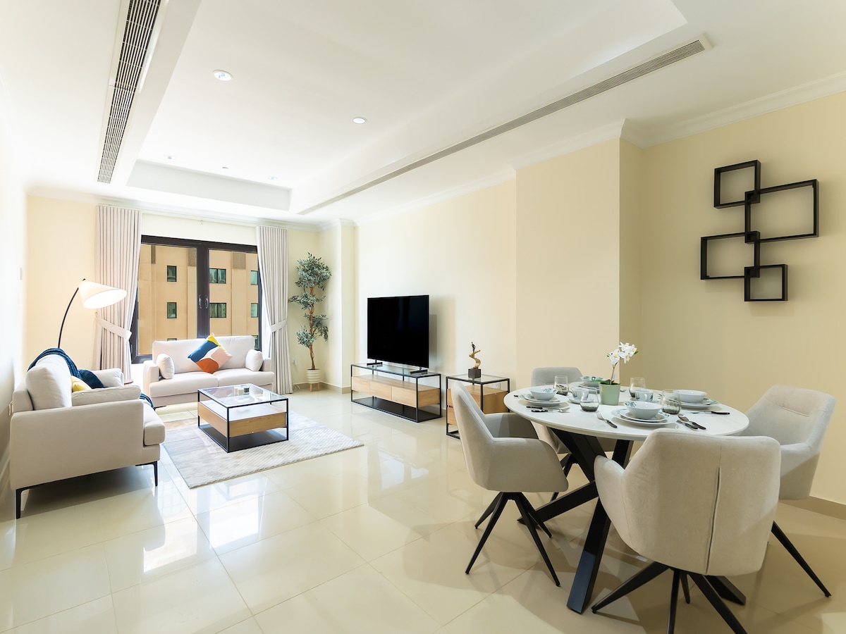 Enjoy your stay at our bright Two-bedroom luxurious apartment in heart of the pearl ,is centrally located to many restaurants, cafe shops ,shopping, and nightlife with sea view , Wonderful location to spend time with family, friends, or business. Amenities include access to Private Beach ,Free Parking, High-Speed WiFi, Fully equipped kitchen- Washer and dryer. gym, swimming Pool and kids Play area ,Marina walk A reception service is available for any assistance, free Luggage service
