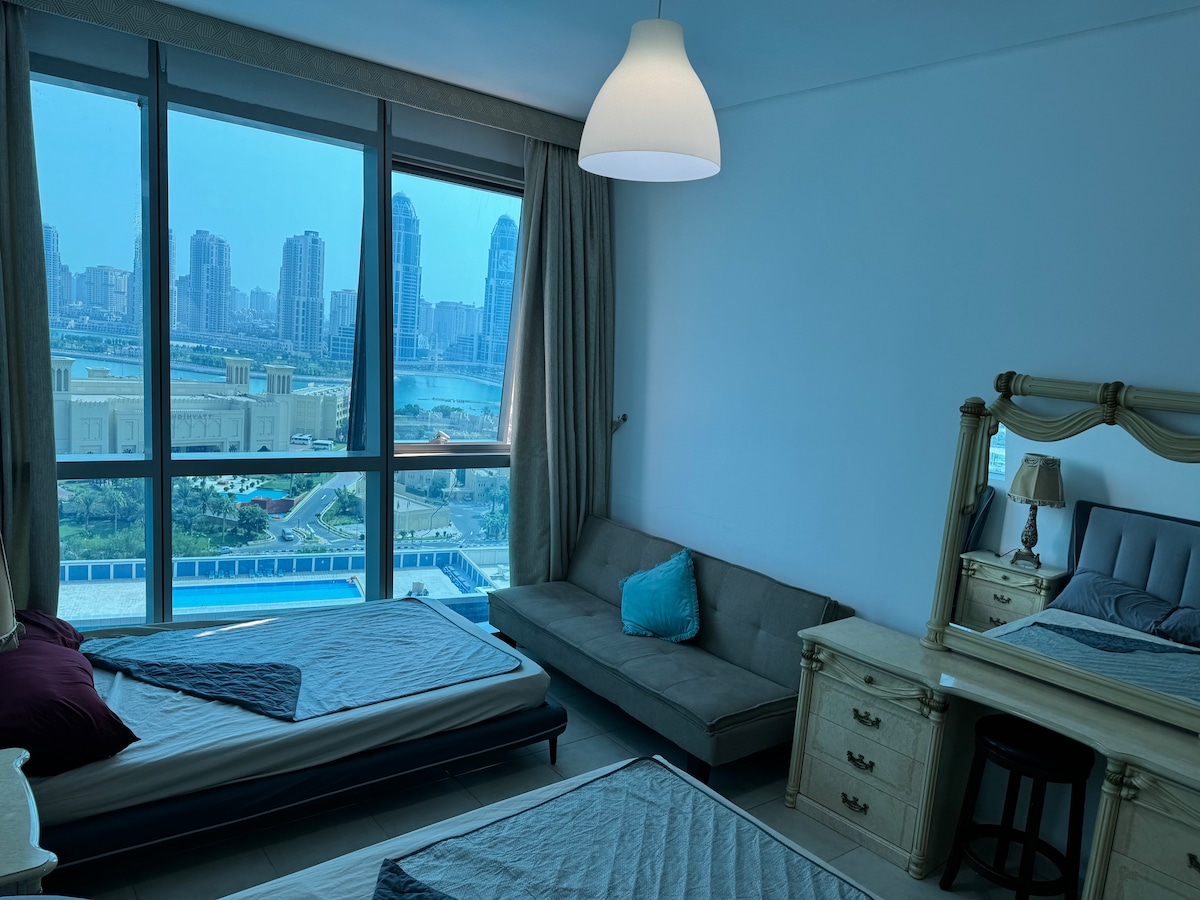 Two bedrooms with a lovely view of the sea in Lusail (The best area in Doha). Close to a Metro Station, shopping mall, a grocery, and a restaurant. Free Wifi and all bills are included. Parking, Gym, Swimming pool, Steam room, and Jacuzzi are all included in the facilities. * 1 minute walking from the metro station. * 3 minutes walking to the nearest grocery. * 15 minutes walking to the nearest shopping mall. * 10 minutes walking to the street food. * Close to "Al Bayt" Stadium.