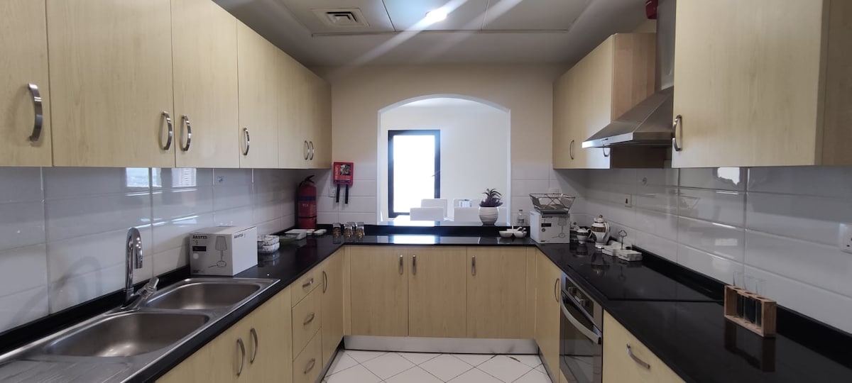 Enjoy your stay at our bright Two-bedroom luxurious apartment in heart of the pearl ,is centrally located to many restaurants, cafe shops ,shopping, and nightlife with sea view , Wonderful location to spend time with family, friends, or business. Amenities include access to Private Beach ,Free Parking, High-Speed WiFi, Fully equipped kitchen- Washer and dryer. gym, swimming Pool and kids Play area ,Marina walk A reception service is available for any assistance, free Luggage service