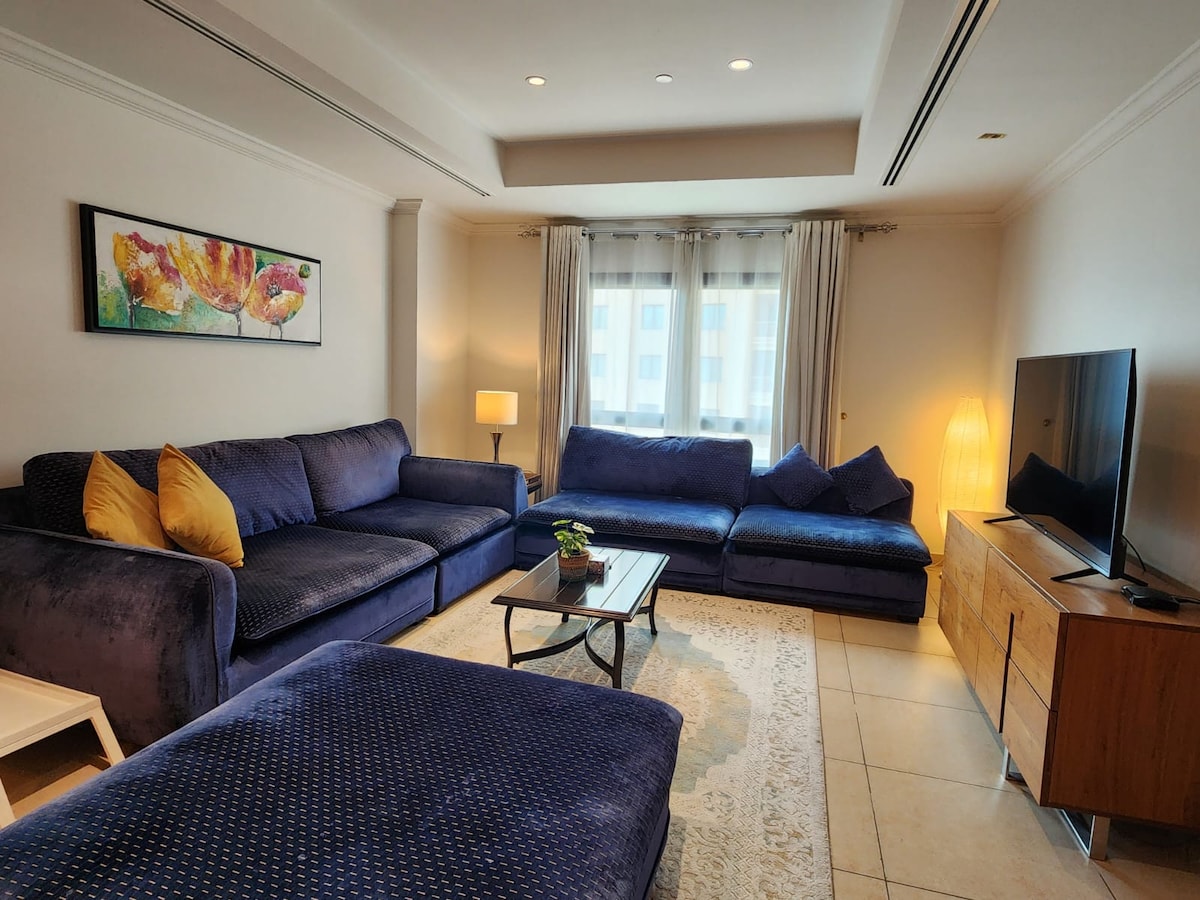 Enjoy your stay at our bright Two-bedroom luxurious apartment in heart of the pearl ,is centrally located to many restaurants, cafe shops ,shopping, and nightlife with sea view , Wonderful location to spend time with family, friends, or business. Amenities include access to Private Beach ,Free Parking, High-Speed WiFi, Fully equipped kitchen- Washer and dryer. gym, swimming Pool and kids Play area ,Marina walk A reception service is available for any assistance, free Luggage service