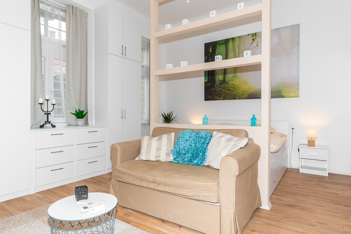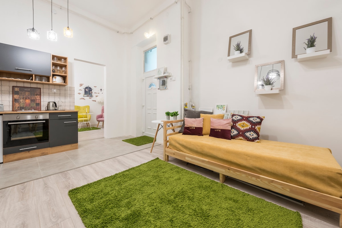Colourful and spacious apartment furnished leisurely, ready to host up to 4 guests on 40 sqm, with a bedrooms, a living room, a bathroom and balcony with view to the vivid streets of district 7. The apartment was completely renovated offering a comfortable stay for families or group of friends. I