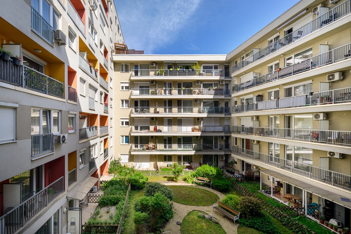 This raised-bedroom ground-floor apartment in Budapest’s vibrant 9th district features a bedroom and workspace on an elevated level, offering privacy and clear separation from the living area. Ground-floor access makes entering with luggage hassle-free 🚌 Excellent transport links, including trams, buses, and the HÉV at Boráros Square, plus nearby MVM Dome and Müpa, make it ideal for city exploration, events, and cultural programs. 🎶 Perfect for couples or solo travelers.🌆✨