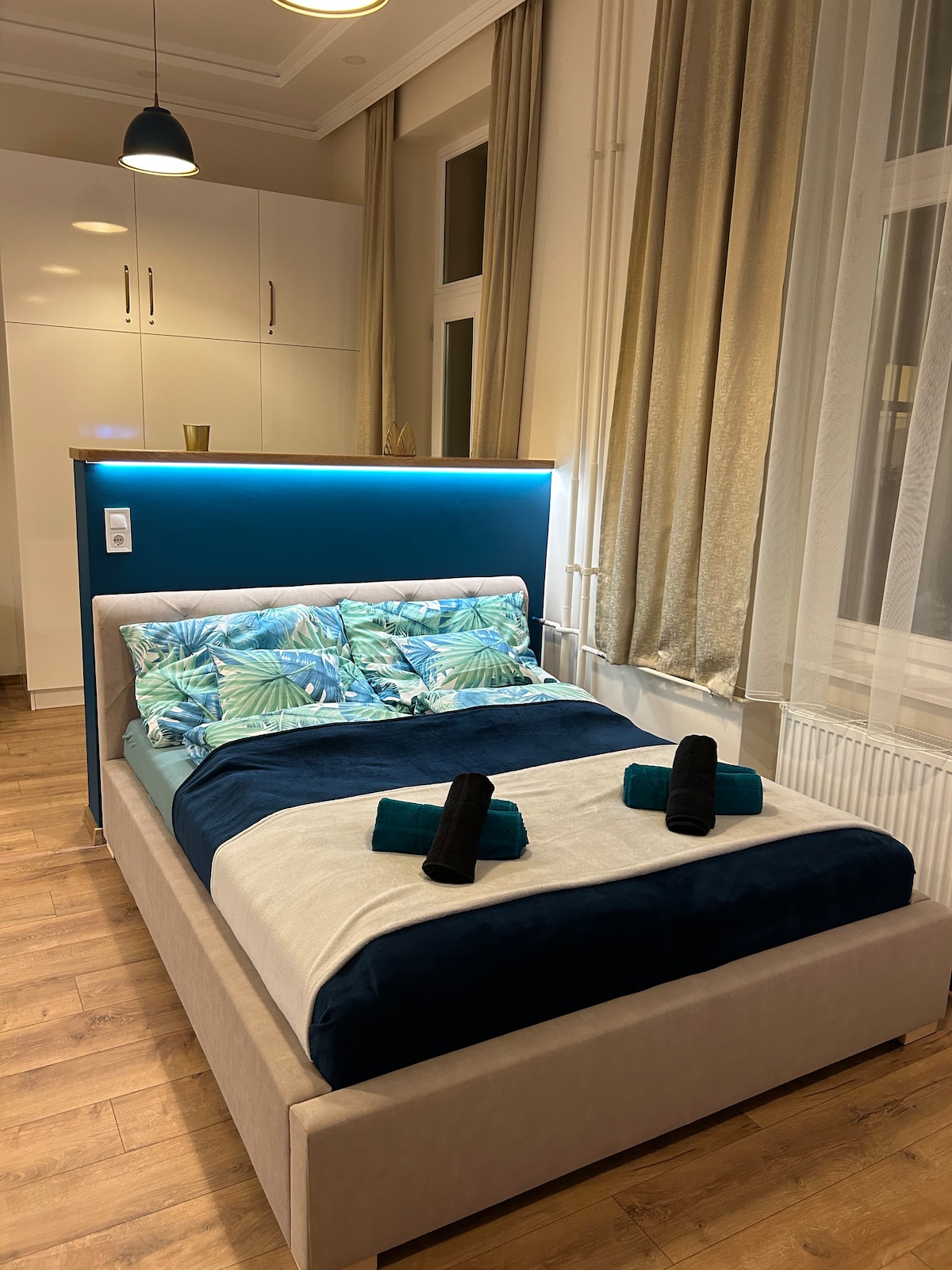 Enjoy your stay in this peaceful and central Budapest accommodation, with a terrace and windows overlooking a quiet courtyard. Elegant and comfortable furnishings ensure your rest and relaxation. The apartment can comfortably accommodate 4 people. You can also relax on the balcony. Tourist attractions and culinary experiences in the area are just a few steps away. Numerous restaurants, bars, pubs await you. The accommodation is close to all public transport.