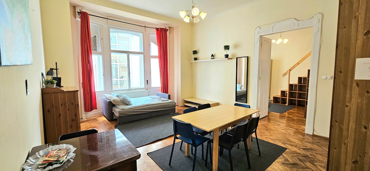 Huge and comfortable 90m2 flat awaits its guests. 2 minutes away from river Danube and the most central tramline of Budapest, it is an ideal place for starting to discover the beauties of the city. Lots of good restaurats and street fooders near the place. Also WIFI, 4K TV and massage shower ensures that you will have pleasure during your stay. Garage 5€/night. Pet 5€/Night/pet