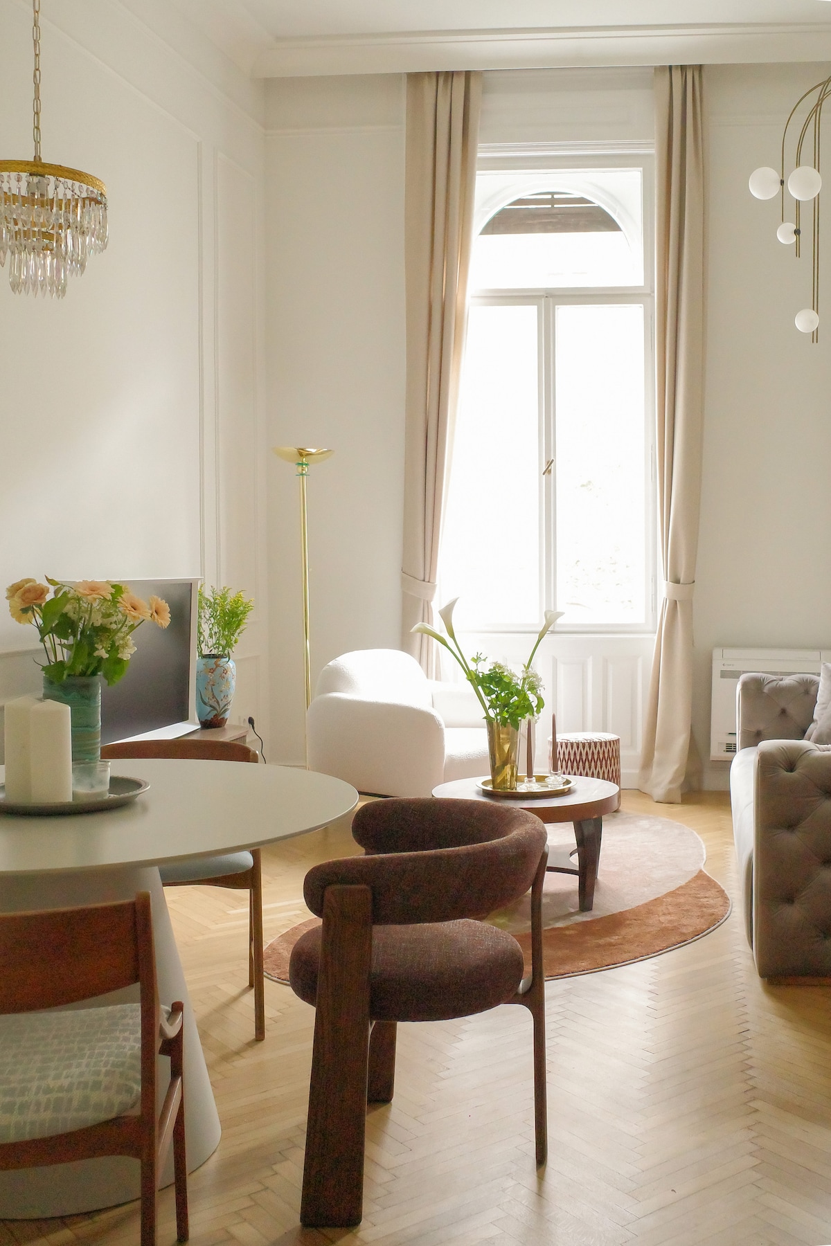 Location is the epicentre of Budapest, 20 meters from the Chain Bridge. The 150 years old, listed house was designed by the same architect as the Parliament and has a decadent, old beauty while the apartment is very simple and basic, a bit industrial but feels home immediately. The flat looks onto a green, inner courtyard between houses. Split air conditioner from 5 June 2025.