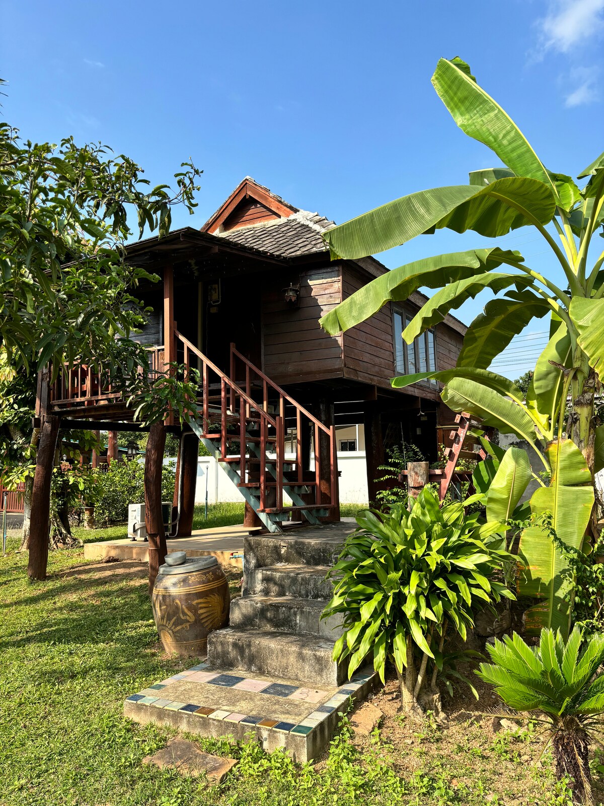 Relax in a peaceful wooden home surrounded by lime, jackfruit, starfruit, and mango trees, offering a true nature-filled escape. This cozy retreat overlooks the mountains and sits in a quiet, in San Sai, close to local markets, restaurants, and just 20 minutes from Central Festival Mall. Enjoy wide open green space, a bonfire area, and ample parking for cars and motorbikes. The property is pet-friendly, spacious, and perfect for guests looking for a calm, refreshing oasis away from the city.