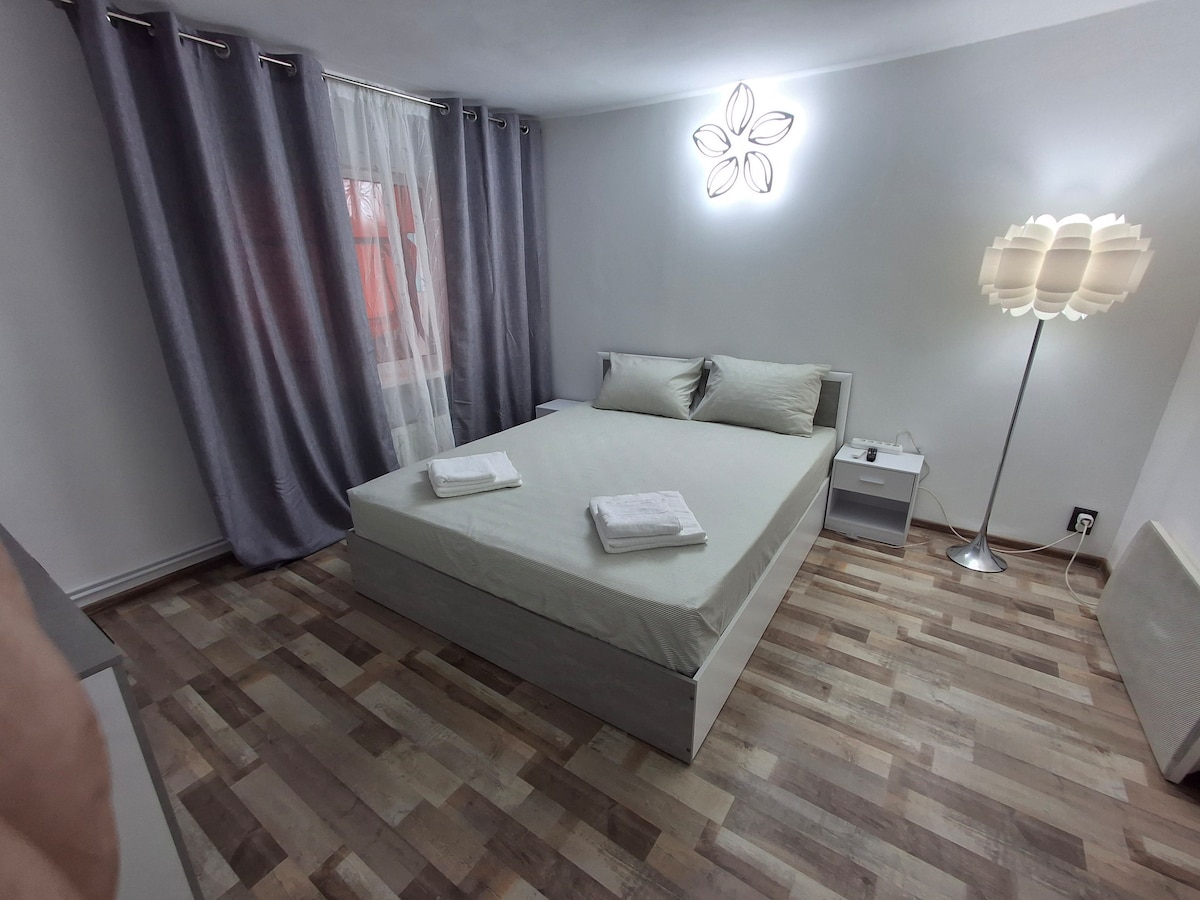 Our cozy & modern 2-rooms apart. is located in the peaceful Hanul Doctorului - Panoramic area. Perfectly furnished and fully equipped, it features a central heating system, AC, TV, free WiFi, double bed and an extendable sofa to ensure a comfortable stay. The flat is very close to the airport and offers excellent access to local attractions. It's just 5 min from Electroputere Mall, 10min to the city center (Xmas Market), 10 min to Parcul Romanescu (Easter Fair), less than 500m from a bus stop.
