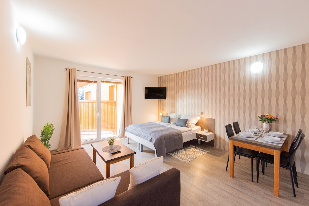 Apartament Studio to niezależna, dwukondygnacyjna przestrzeń ponad 80m2, z osobnym wejściem i tarasem. Przeznaczone dla pobytu 4-7 osób, Studio równie dobrze ugości rodzinne grono, paczkę przyjaciół jak i dwie pary, a nawet dwie rodziny. Znajdziecie tu przestronny salon kominkowy ze strefą wypoczynkową z dużymi przeszkleniami do zabaw z dziećmi, tańca czy jogi, kuchnię z jadalnią dla 10 osób, kamienny taras ze stolikiem kawowym, sofą i fotelami oraz dwie zamykane sypialnie.