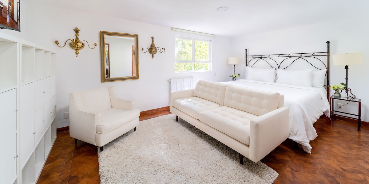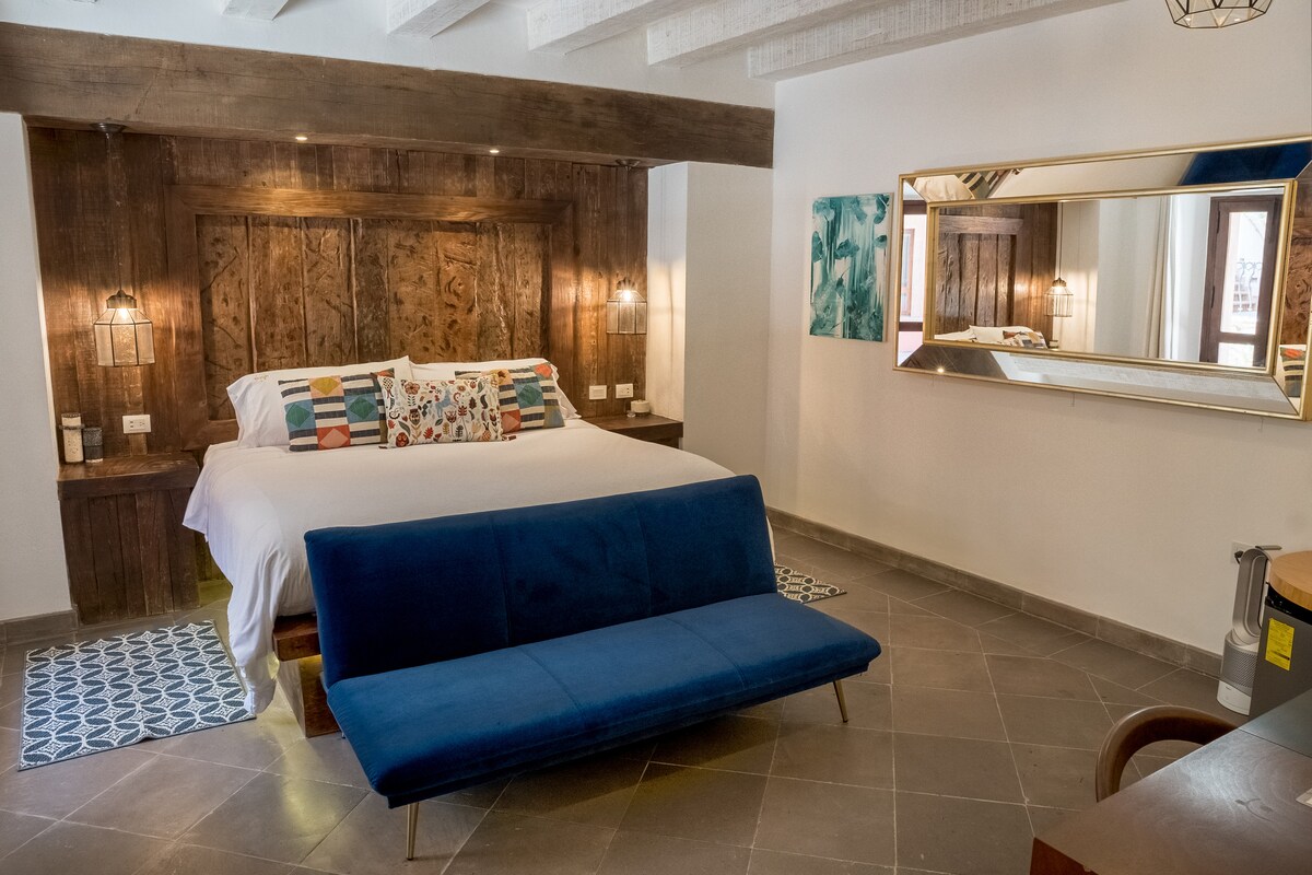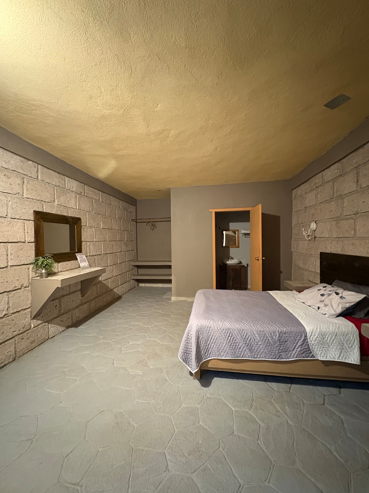 Relájate en la cómoda cama queen size con almohadas mullidas después de un día de exploración. El armario de madera vintage y la decoración cuidada le dan un toque único, mientras que el área de estar con sillones es perfecta para relajarte. La habitación cuenta con su propio baño privado y moderno, con una regadera espaciosa. Además, estamos a solo unos pasos del famoso Mercado de Artesanías, lo que te permite sumergirte en la cultura local.