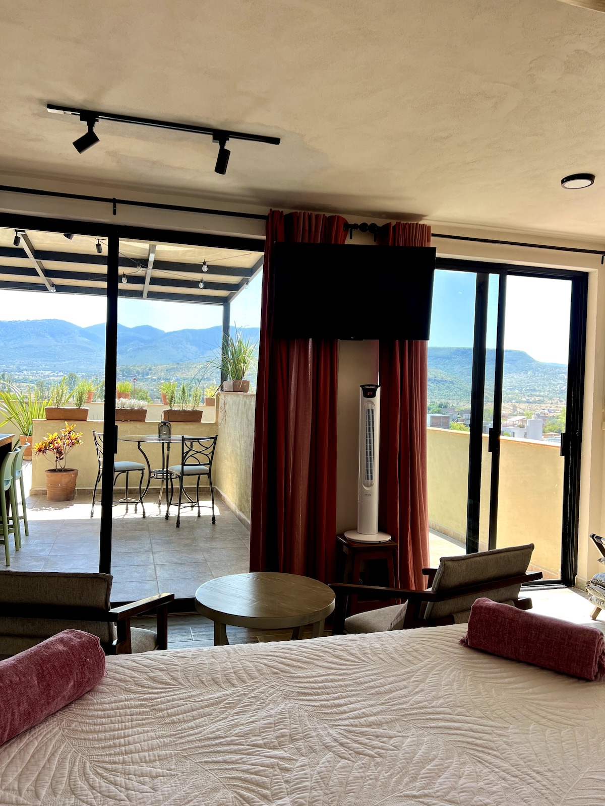 Colibrí es un penthouse rodeado de luz y montañas. En la terraza privada puedes disfrutar del amanecer y el atardecer, o relajarte en el jacuzzi. Se ubica en segundo piso por lo que es necesario subir escaleras. Desde la cama tienes vista directa a las montañas. Ideal para viajeros que buscan calma, comodidad y naturaleza. Desayuno, comida o cena por reservación. Contamos con estacionamiento A solo 17 min del centro y 5 min del centro comercial La Luciérnaga en auto