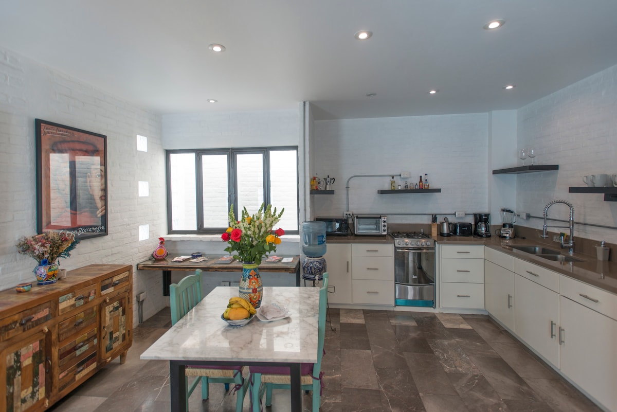 We are following Airbnb's recommendations for your safety, sanitizing all areas. Spacious 90 sqm Loft, with its own cozy style, living room, dining room, kitchen, king size bed, located on the ground floor of the property, with access to the roof terrace. 2 blocks from the historic center and the Parish of San Miguel de Allende and half a block from the craft market, peaceful for your rest, furnished with everything you need. Everyone is welcome here for a peaceful stay.