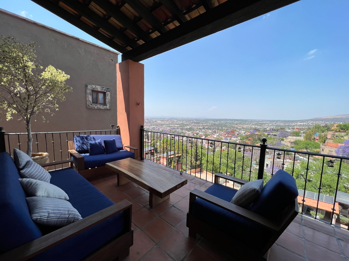A sólo 700 mts. de la parroquia de San Miguel de Allende. Excelente vista desde su amplia terraza y roof garden. Amplio departamento, en tranquilo fraccionamiento con seguridad y sin problema de estacionamiento. En calle cerrada sin movimiento y silenciosa, pero muy cerca del centro