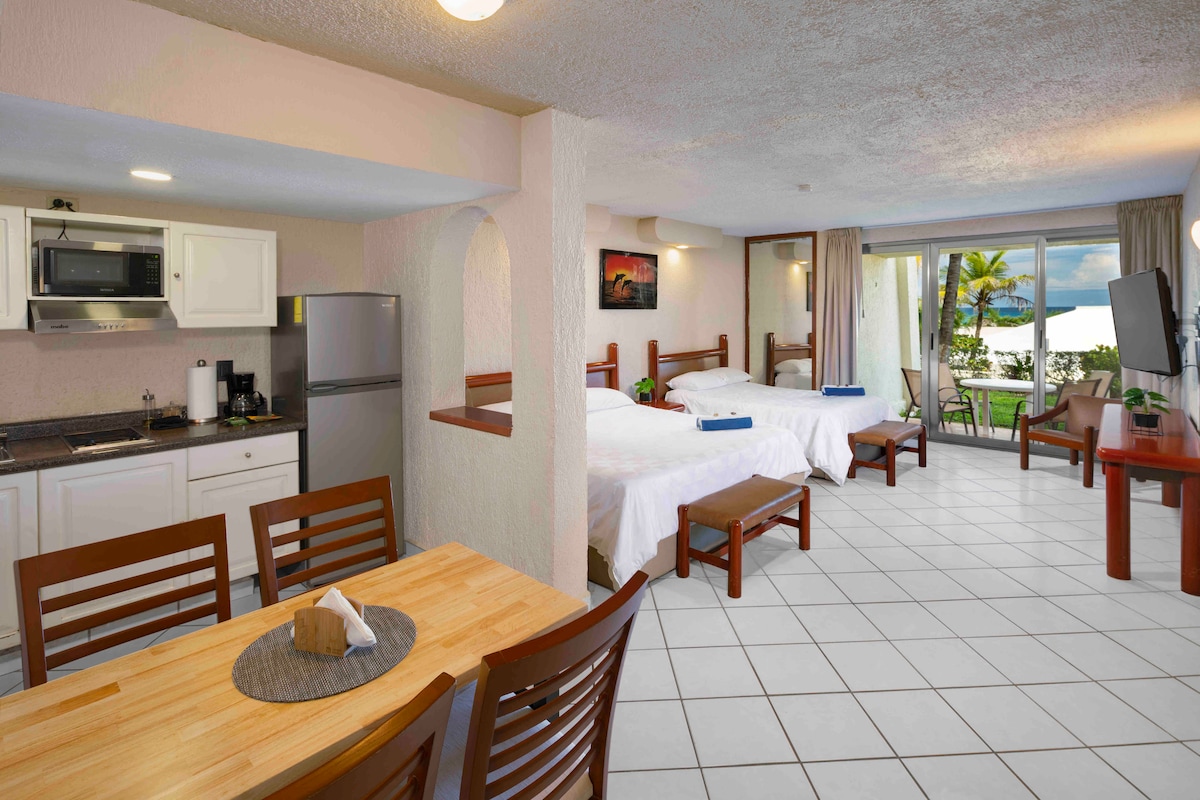 This newly renovated room as an amazing view from both its windows, a balcony. The room is relatively small but has 2 queen size beds which sleeps 4 people comfortably. There is no kitchen but there is a mid size refrigerator, a microwave and a drip coffee maker. Besides having direct access to the beach, you have a huge pool, with a large children area, a restaurante right on the Ocean, a convenient store and coin laundry on the condo premises. Security and free safe parking are included.