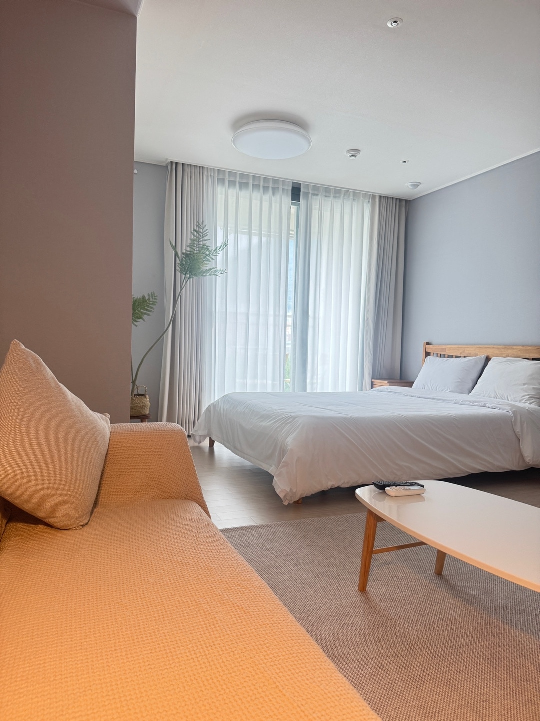 여수시 국동에 위치한 신축 레지던스입니다. 더블 베드 1개, 욕실 1개 당일입실가능합니다. 010~3311~1335 대환영/한달살이/연박할인 *원룸형으로 거실,부엌,화장실,베란다로 구성되어 있습니다 *2인기준 최대3인까지 가능하며 인원 추가시 20,000원 있습니다(추가시 따로 연락주시면 됩니다) *연박시 룸서비스는 제공되지 않습니다