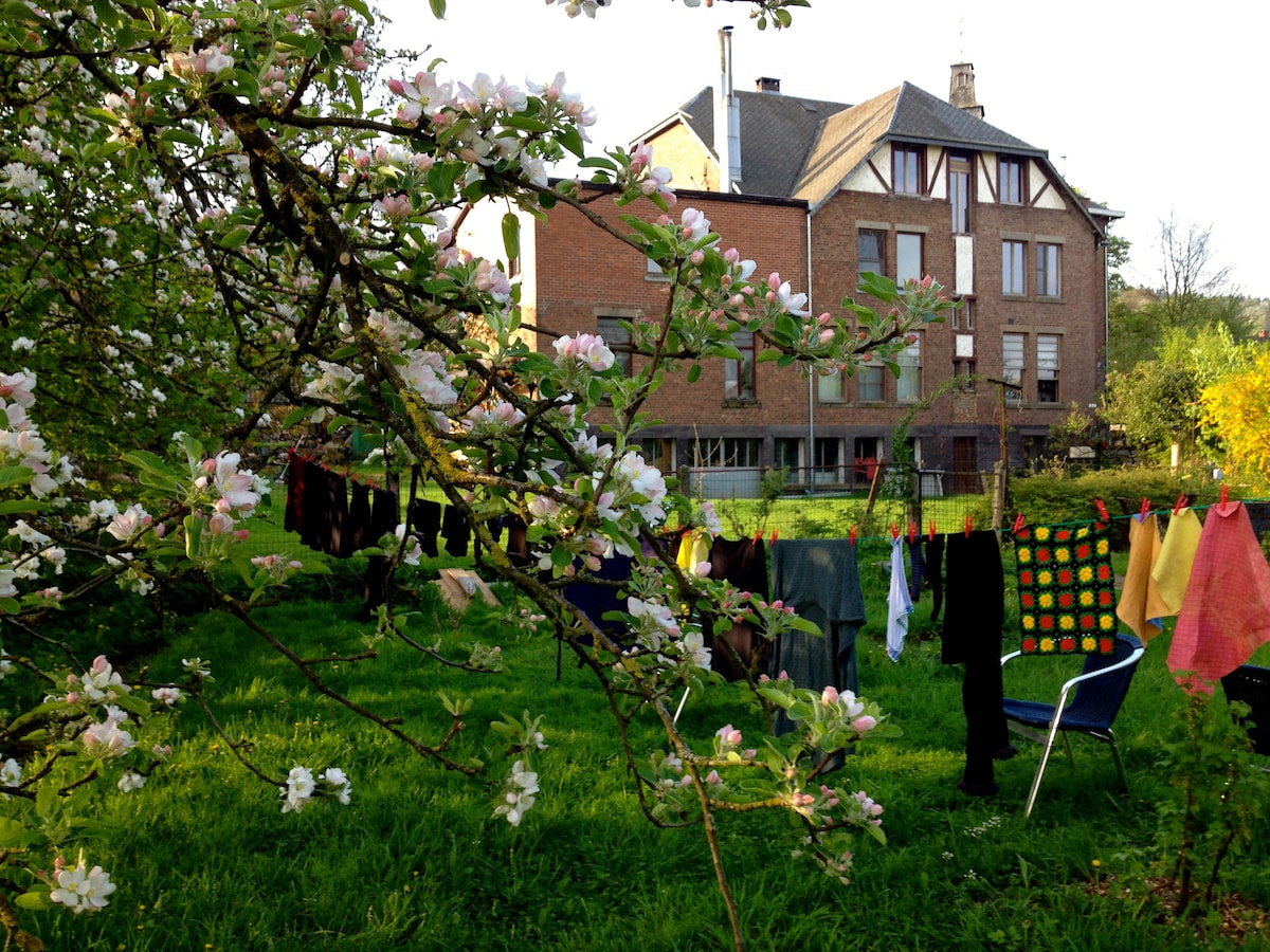 Appartement situé dans un hameau calme et paisible à 15 minutes de Dinant et de Namur, pas de voisin. L'appartement se trouve dans une ancienne maison type maison de maître entouré d'un parc avec des moutons . L'appartement dispose d'une chambre avec deux lits, pouvant accueillir 3 personnes au total (un lit double et un lit simple). Cuisine équipée avec frigo, four, four micro-ondes, taque vitrocéramique. Grand salon avec petite télévision par câble, bureau. Wi-fi gratuit.