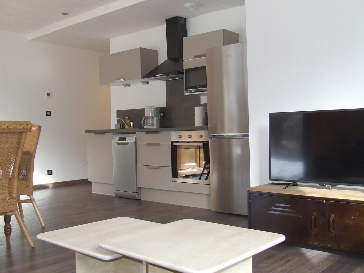 appartement de 45 m2 situé au 2 ème étage de ma maison, il dispose d'une chambre avec 1 lit double ainsi qu un lit 1 place, un salon avec canapé ainsi q un canapé lit BZ de 140/190,une cuisine équipée, une salle de bain les draps, serviettes de toilette et le ménage sont inclus dans le prix l'accès se fait par la cage d'escalier principale , le quartier est calme et agréable à moins de 5 minutes du centre-ville avec commerces Un garage pour motos et velos est à disposition si besoin